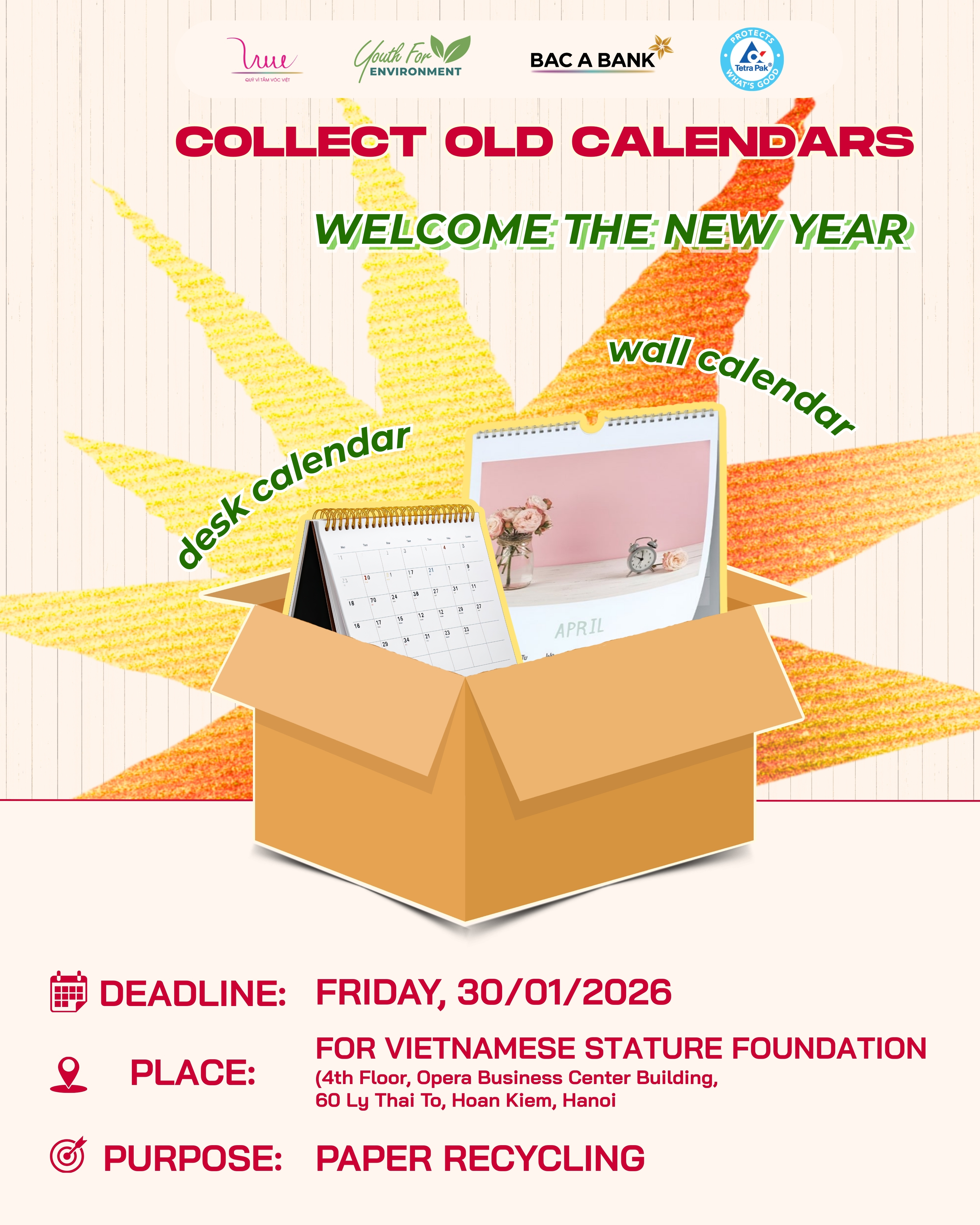 With the desire to reduce waste and spread a sustainable lifestyle, the Youth for Environment project of For Vietnamese Stature Foundation (VSF) has launched an old calendar collection activity. All collected calendars will be sent to the Green Life project and a paper recycling factory, contributing to transforming past calendar pages into new values.