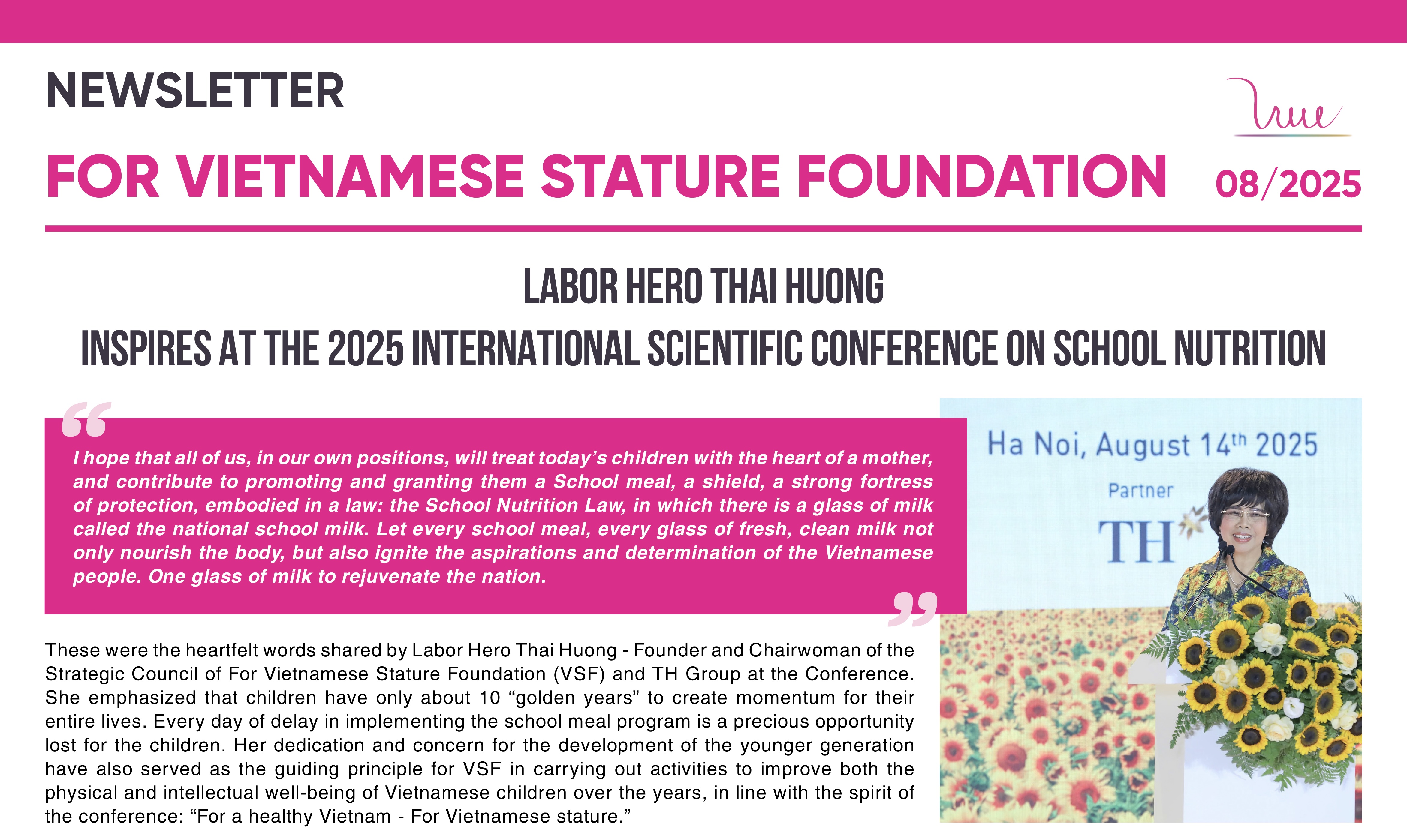 Labor Hero Thai Huong - Founder and Chairwoman of the Strategic Council of VSF and TH Group - delivered an inspiring speech at the 2025 International Scientific Conference on School Nutrition. She emphasized that children have only about 10 “golden years” to create a foundation for their entire lives. Her dedication and concerns for nurturing younger generations have also served as a guiding principle for VSF’s efforts to improve the physical and intellectual well-being of Vietnamese children over the years, in line with the spirit of the conference: “For a healthy Vietnam - For Vietnamese stature.”