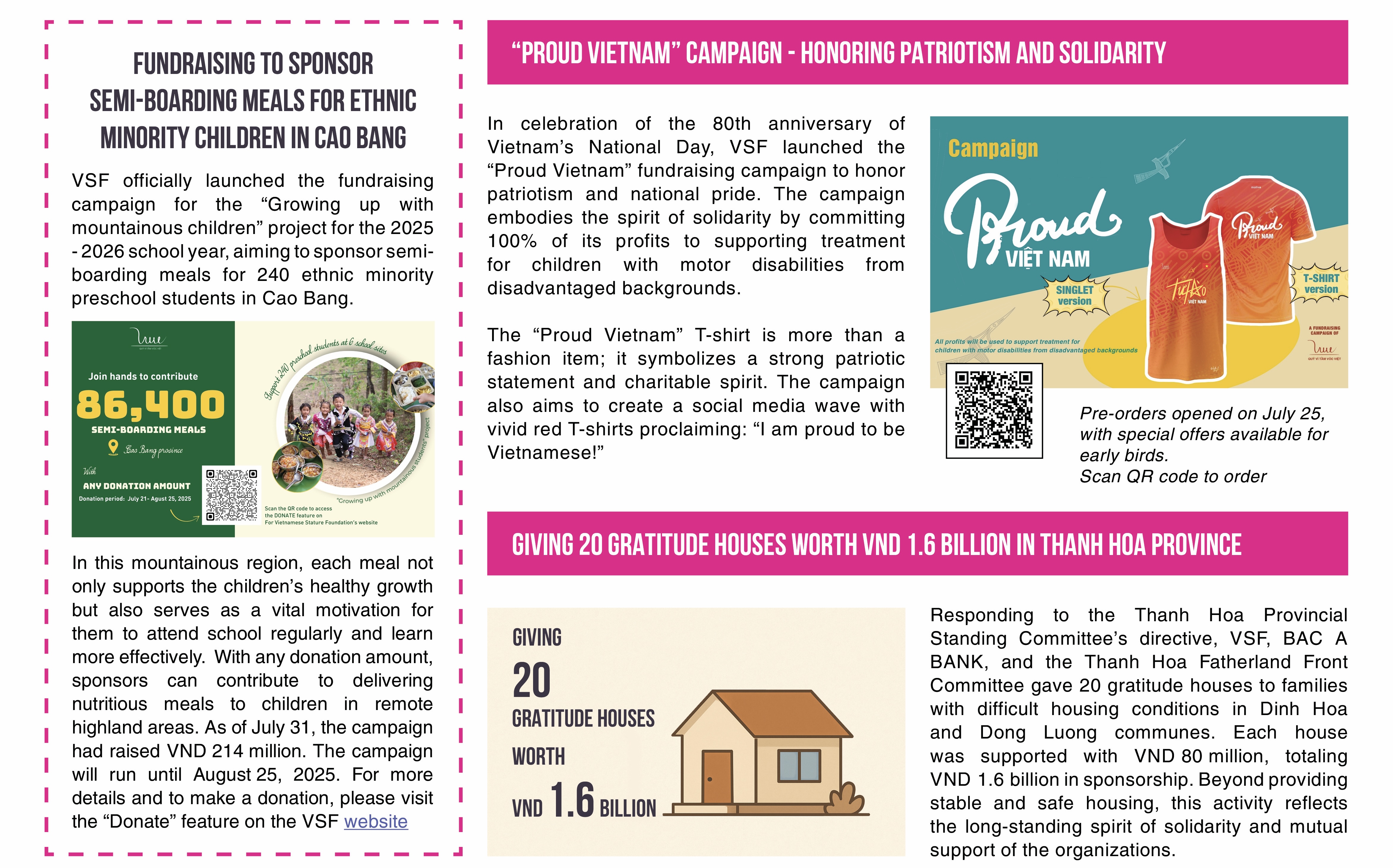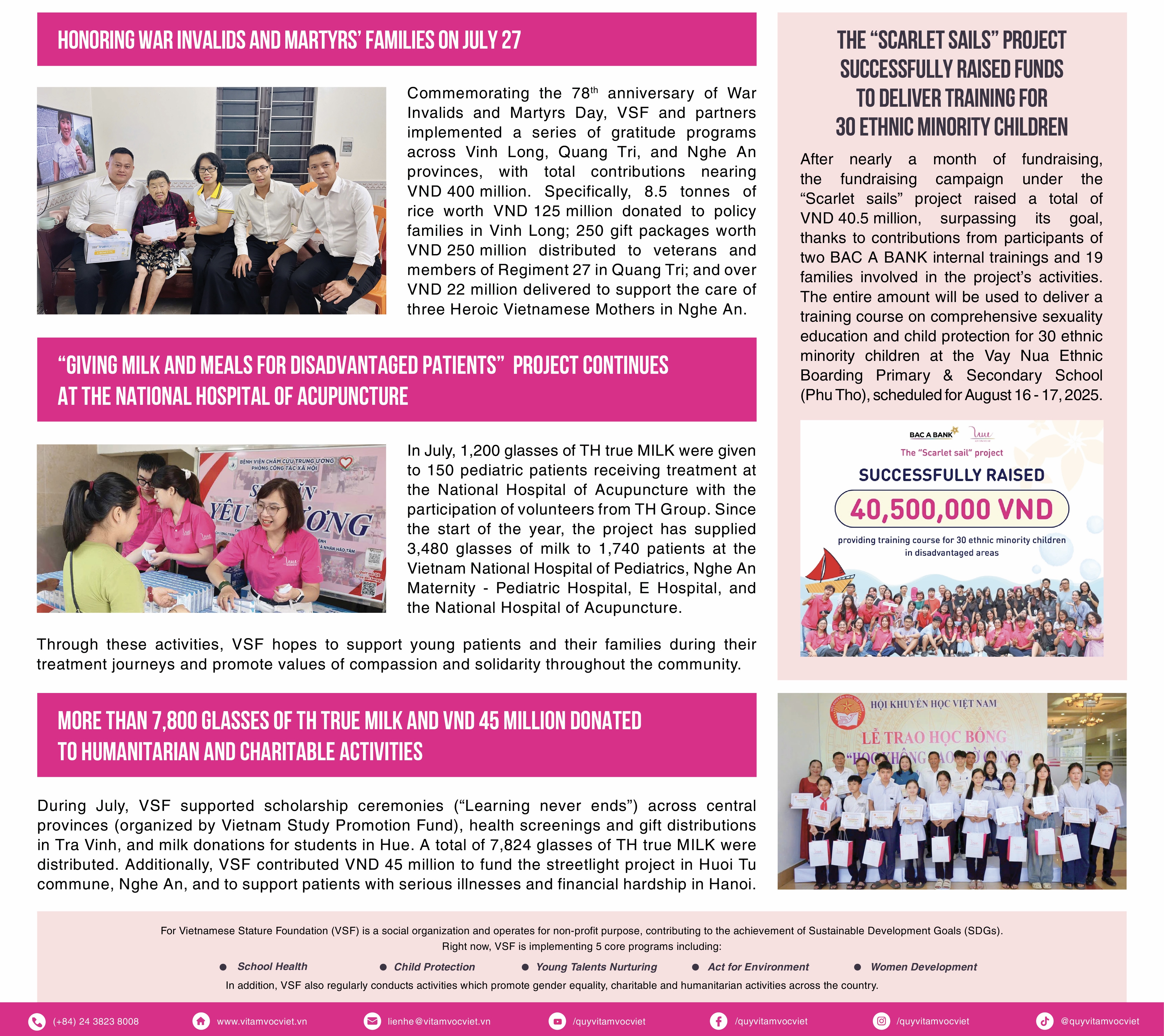 In July 2025, For Vietnamese Stature Foundation (VSF), in collaboration with TH Group and BAC A BANK, donated VND 4 billion in emergency aid to support people in the western region of Nghe An province affected by heavy rains and flooding. The donation included VND 3 billion in cash and VND 1 billion worth of essential goods, reaffirming the three organizations' commitment to standing with communities in disaster response and recovery efforts.