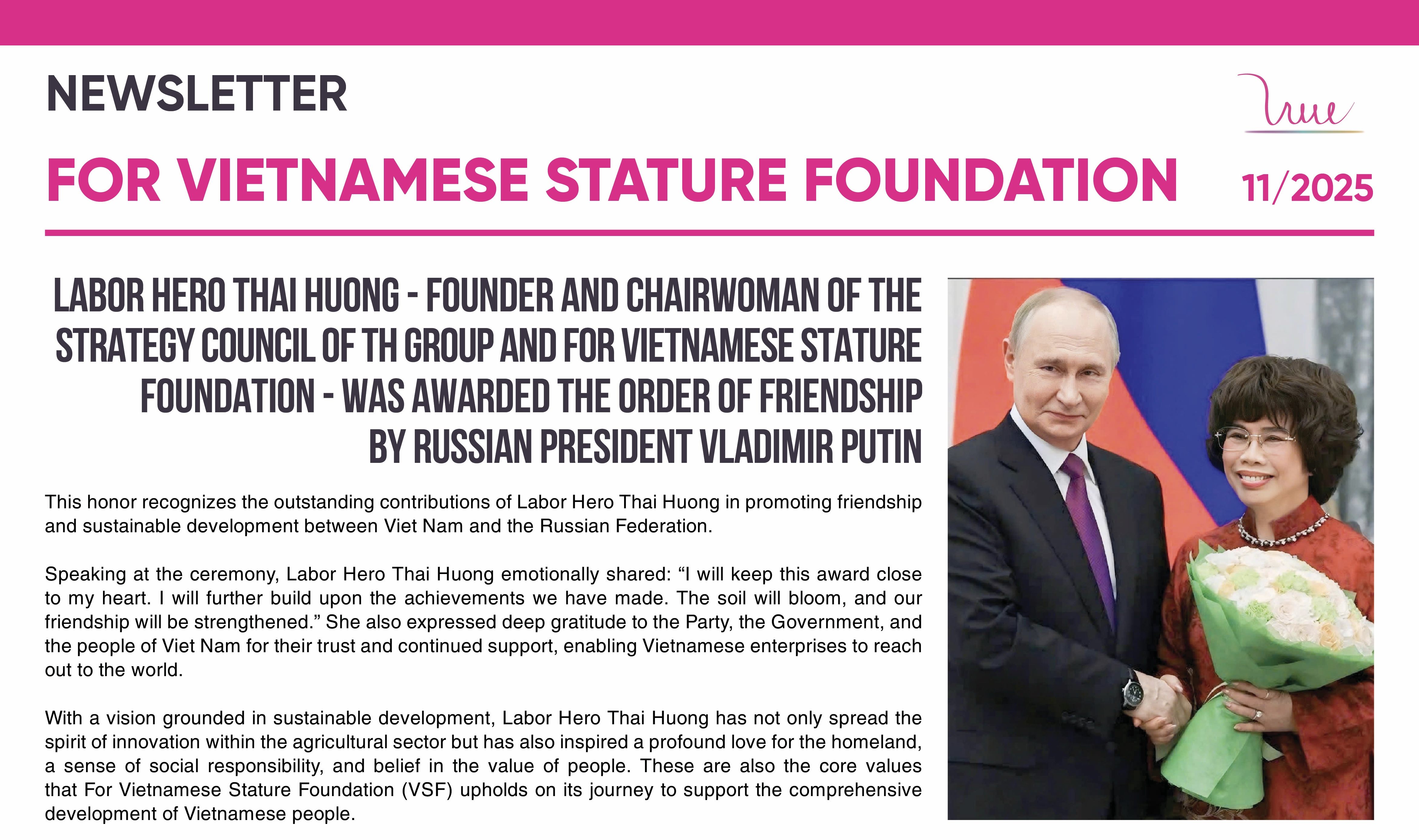 In November 2025, For Vietnamese Stature Foundation (VSF) received good news when Labor Hero Thai Huong, Founder and Chairwoman of the Strategy Council of TH Group and VSF, was awarded the Order of Friendship of the Russian State by Russian President Vladimir Putin. With a sustainable development orientation, Labor Hero Thai Huong not only spreads the spirit of innovation and creativity in the agricultural sector but also strongly inspires love for the country, social responsibility, and faith in human values. These are also the core values that VSF pursues on the journey for the comprehensive development of the Vietnamese people.