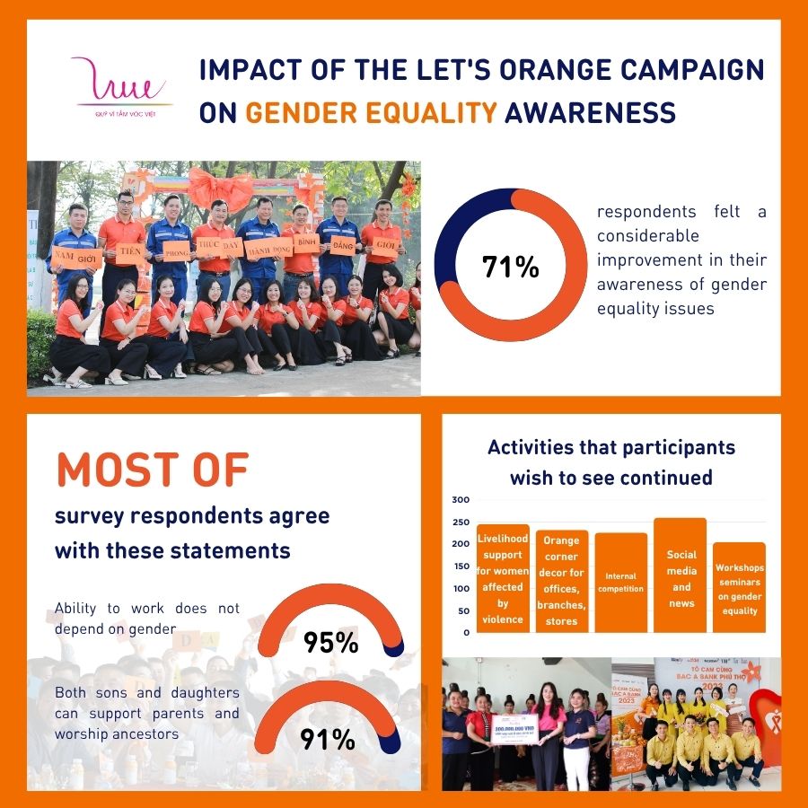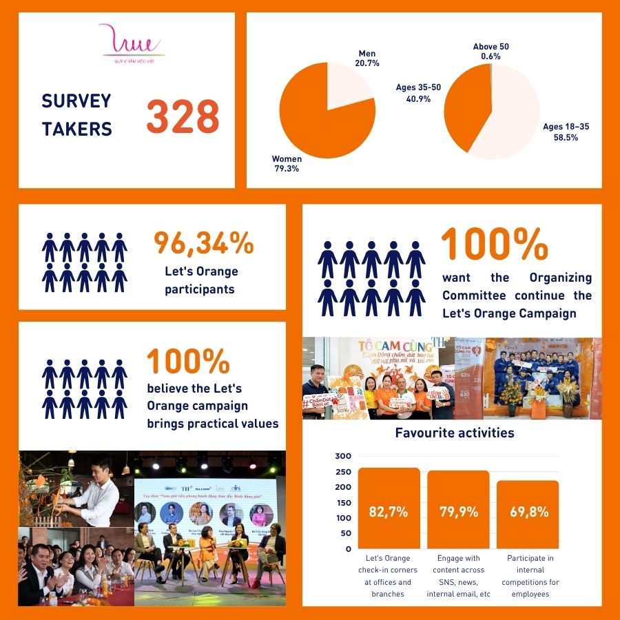 The survey also garnered numerous unique and creative ideas for future Let's orange campaigns, including: producing publications on gender equality, gifting orange-themed cards to customers, creating a chibi mascot for the program, organizing writing/poetry composing/painting/storytelling competitions on gender equality, hosting talk shows and workshops on gender, decorating Let's orange corners at homes, and establishing monthly gender-themed clubs.