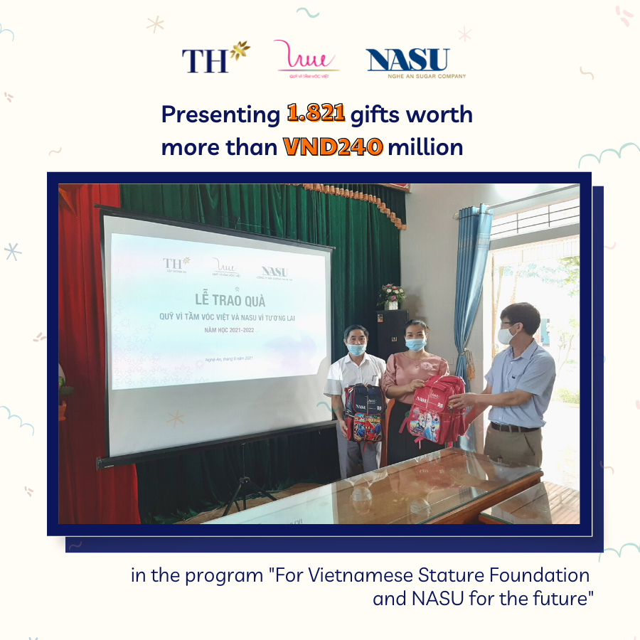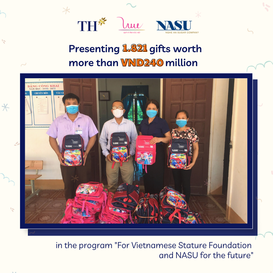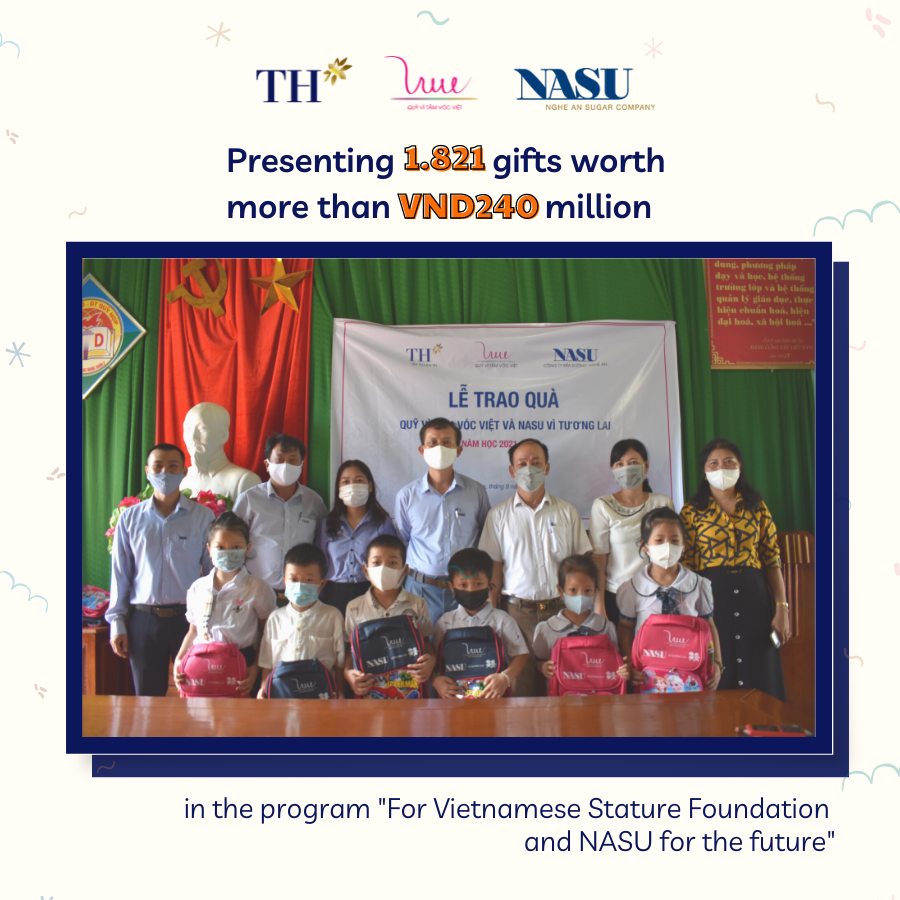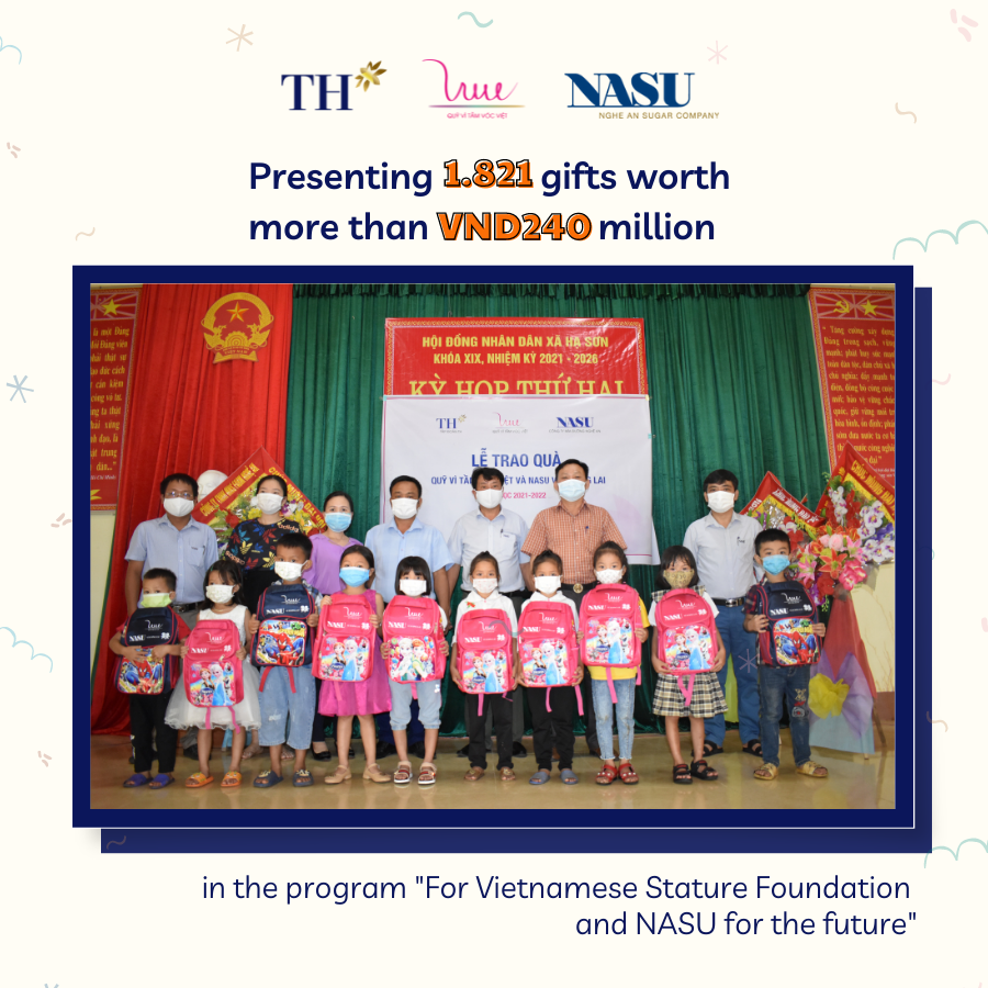 On the occasion of the opening of the school year 2021-2022, For Vietnamese Stature Foundation (VSF), in collaboration with TH Group and Nghe An Sugar Company Limited (NASU), presented gifts to grade 1 students with difficult circumstances in Nghe An with a value of more than VND240 million.
