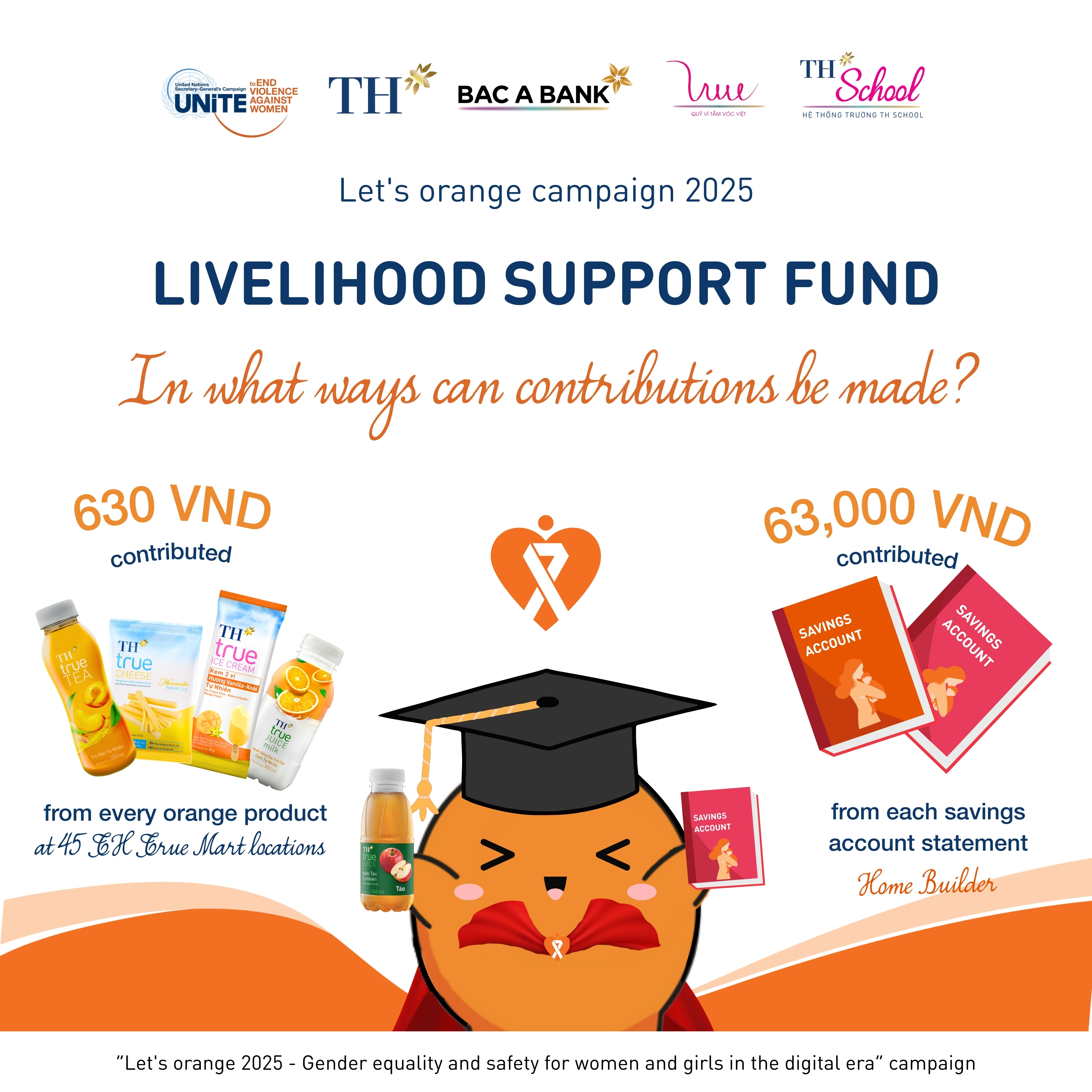 - Buy orange-themed products at TH true mart stores: For every orange-themed product you choose at 45 TH true mart stores, For Vietnamese Stature Foundation (VSF) and TH Group will contribute 630 VND directly to the Livelihood Support Fund.