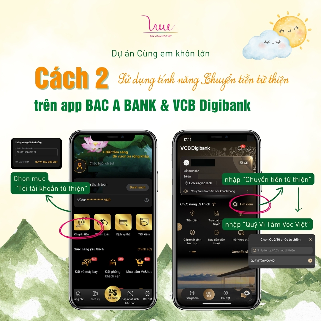 - Cách 2: Ủng hộ thông qua tính năng CHUYỂN TIỀN TỪ THIỆN của BAC A BANK và Vietcombank