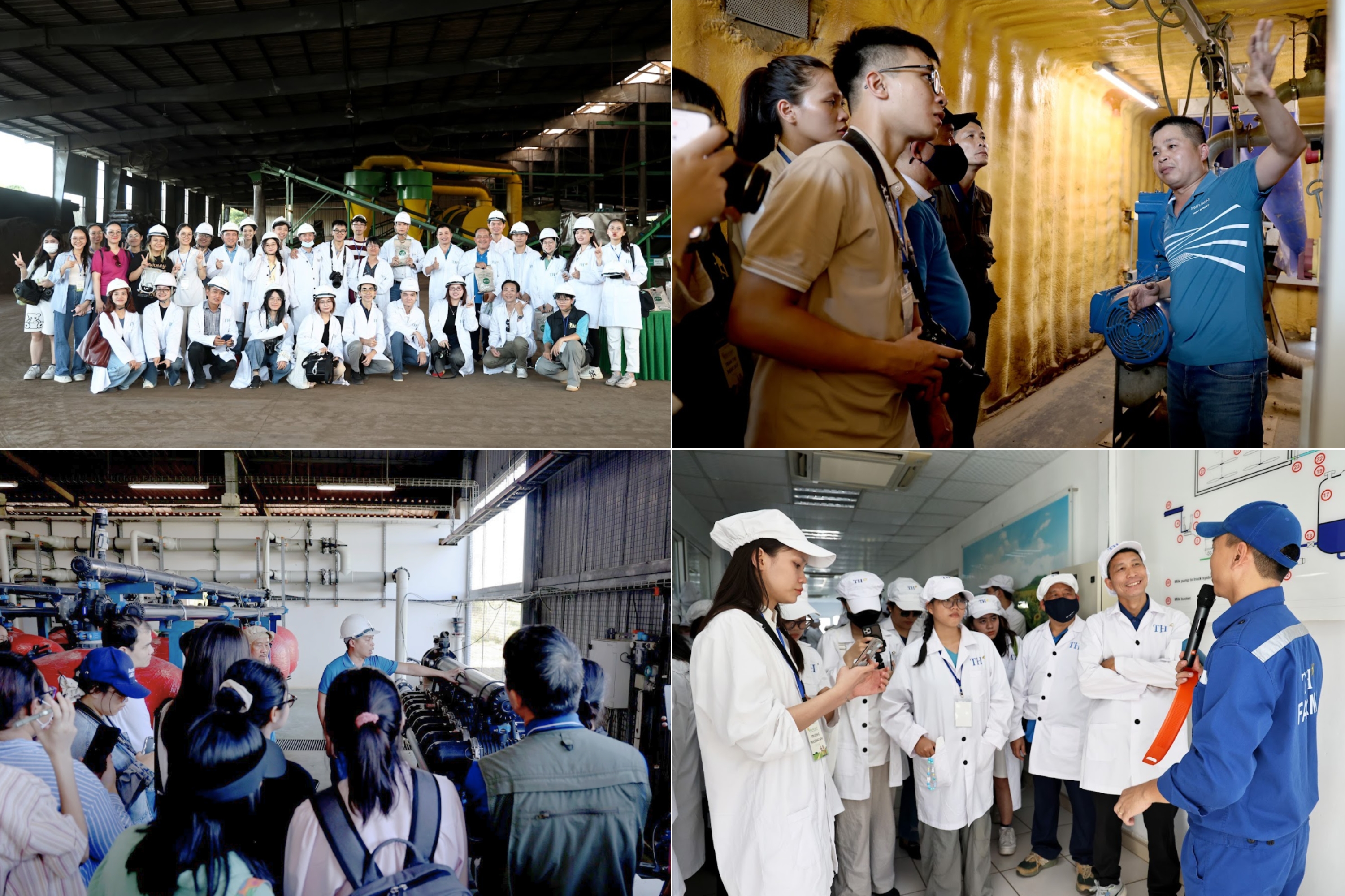 Bên cạnh lý thuyết và thực hành trong lớp, học viên còn được tìm hiểu thực tế về quy trình khép kín của một mô hình kinh tế tuần hoàn thông qua chuyến thực địa tham quan chuỗi cơ sở sản xuất của Tập đoàn TH, bao gồm trang trại chăn nuôi bò sữa, nhà máy sữa, nhà máy lọc và xử lý nước thải, nhà máy sản xuất phân bón hữu cơ,... Tại đây, các học viên không chỉ lắng nghe mà còn trực tiếp đặt câu hỏi và trao đổi với chuyên gia của Tập đoàn TH như anh Phạm Vinh Sơn - Giám đốc Bảo trì Công ty CP Thực phẩm Sữa TH, kiêm Tổng Giám đốc Công ty CP Công nghệ Phân bón Xanh, giúp bổ sung dữ liệu thực tế cho những sản phẩm họ sẽ xây dựng sau khóa học.