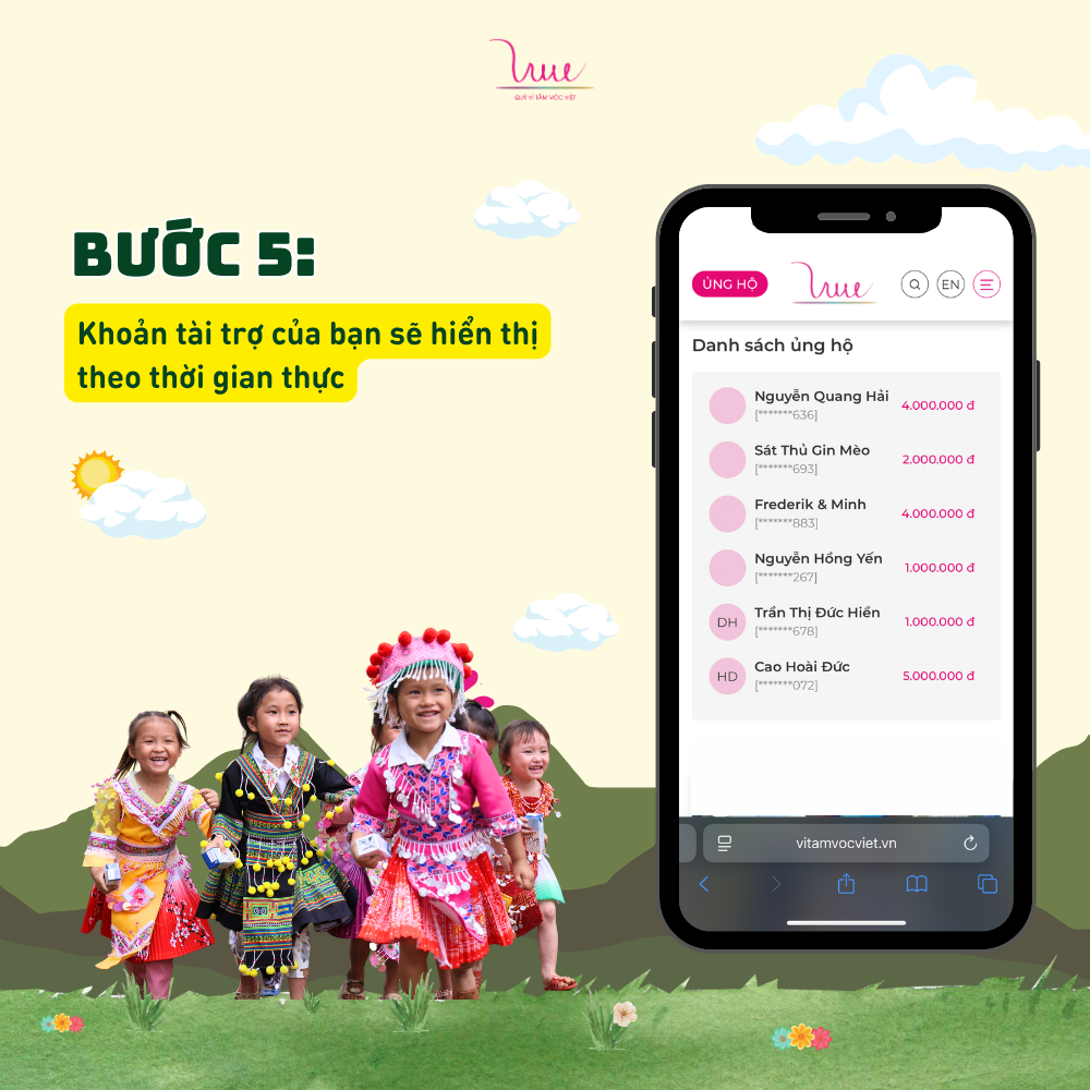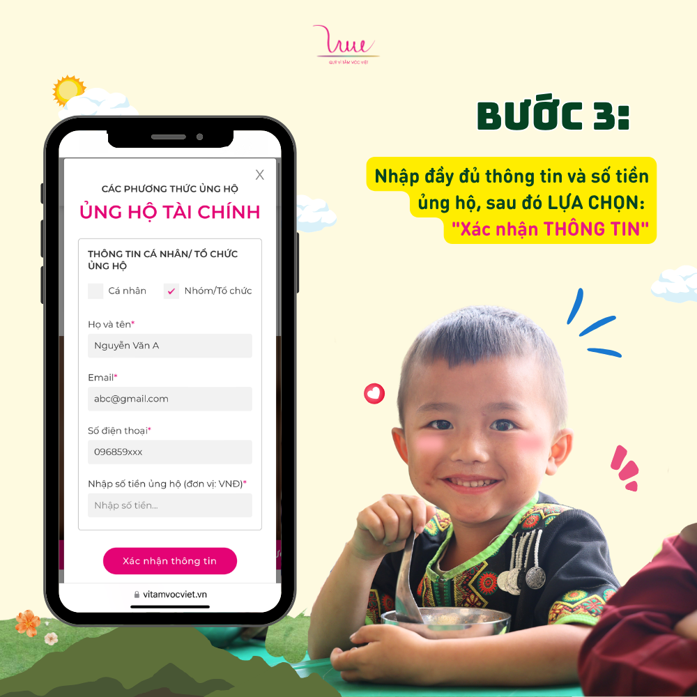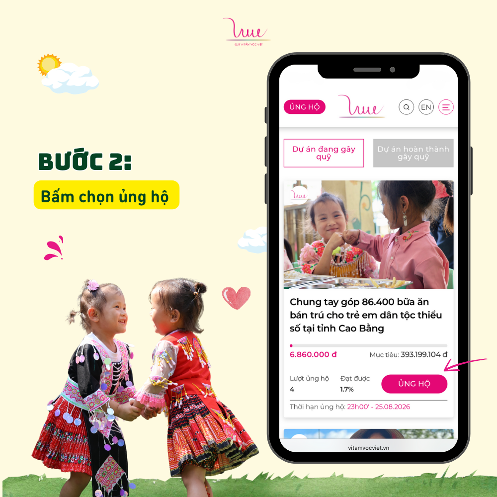 Nếu bạn đã sẵn sàng quyên góp một khoản tiền bất kỳ, hãy truy cập ngay tính năng ỦNG HỘ trên website Quỹ Vì Tầm Vóc Việt để thực hiện 5 bước nhanh - gọn - lẹ này nhé!
