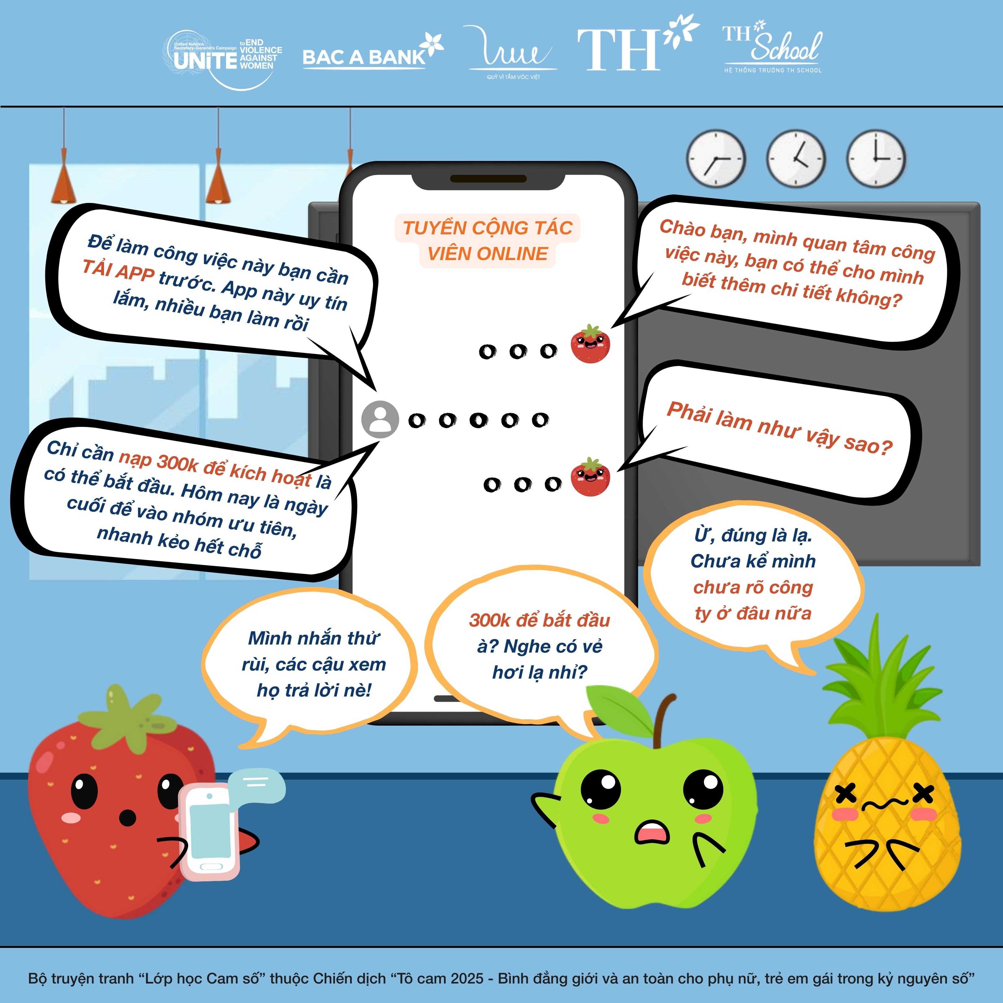 Trong tập này, khi lướt mạng, Táo, Dâu, Dứa bắt gặp một tin tuyển dụng yêu cầu tải app và nạp phí để kích hoạt tài khoản. Càng xem kỹ, cả nhóm càng thấy bất thường: trang mới lập, ảnh ảo, tin nhắn hối thúc và video giới thiệu mờ không rõ mặt.