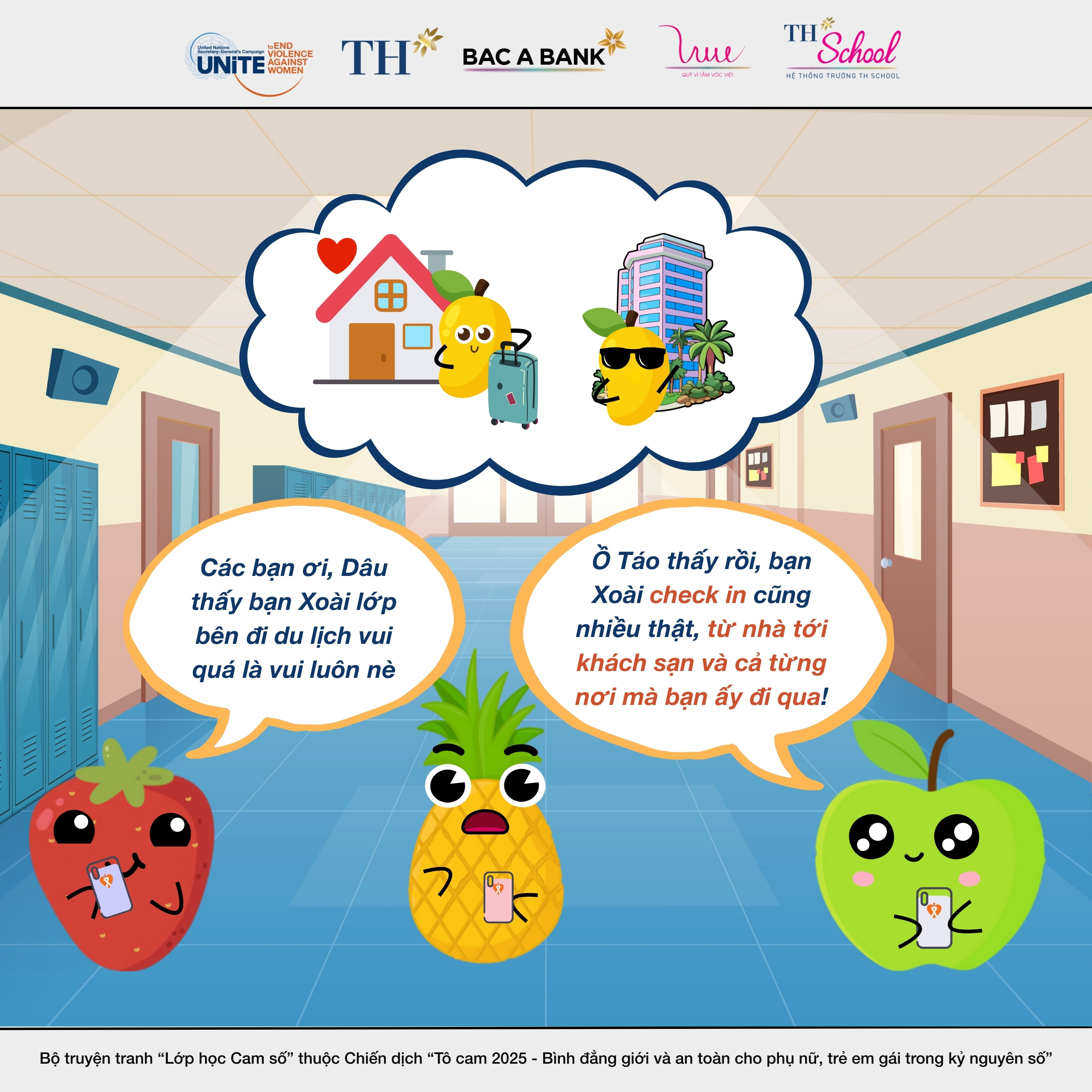 Hôm nay, Dâu, Táo và Dứa bất ngờ phát hiện bạn Xoài lớp bên đang vi vu du lịch, “check-in” ở đủ mọi nơi trên hành trình của mình, từ lúc rời nhà, đến khách sạn, rồi cả những điểm dừng chân thú vị mà bạn ấy ghé qua. Cả nhóm đều rất ngưỡng mộ vì Xoài có một chuyến đi thật vui và đầy trải nghiệm như vậy.