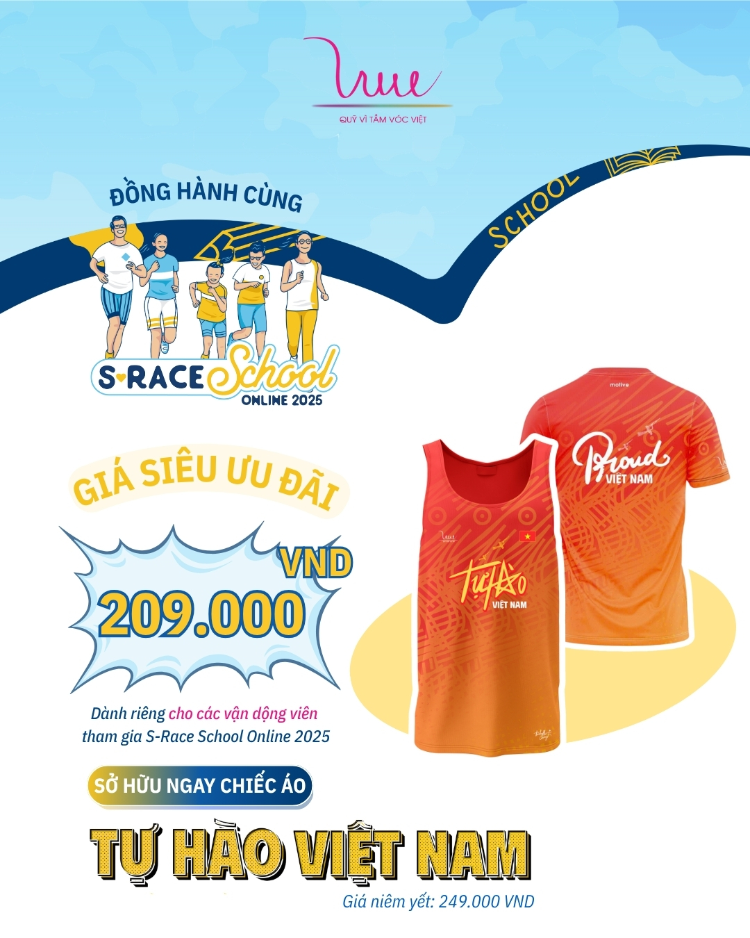 Đồng thời đây cũng là cơ hội để nâng cao tinh thần tương thân tương ái khi: TOÀN BỘ lợi nhuận từ áo và mỗi km bạn chạy trong thử thách S-Race School Online 2025 sẽ được quy đổi thành khoản đóng góp để gây quỹ hỗ trợ bệnh nhi khuyết tật vận động cho bệnh nhi có hoàn cảnh khó khăn, biến từng bước chạy của bạn thành hành động sẻ chia!
