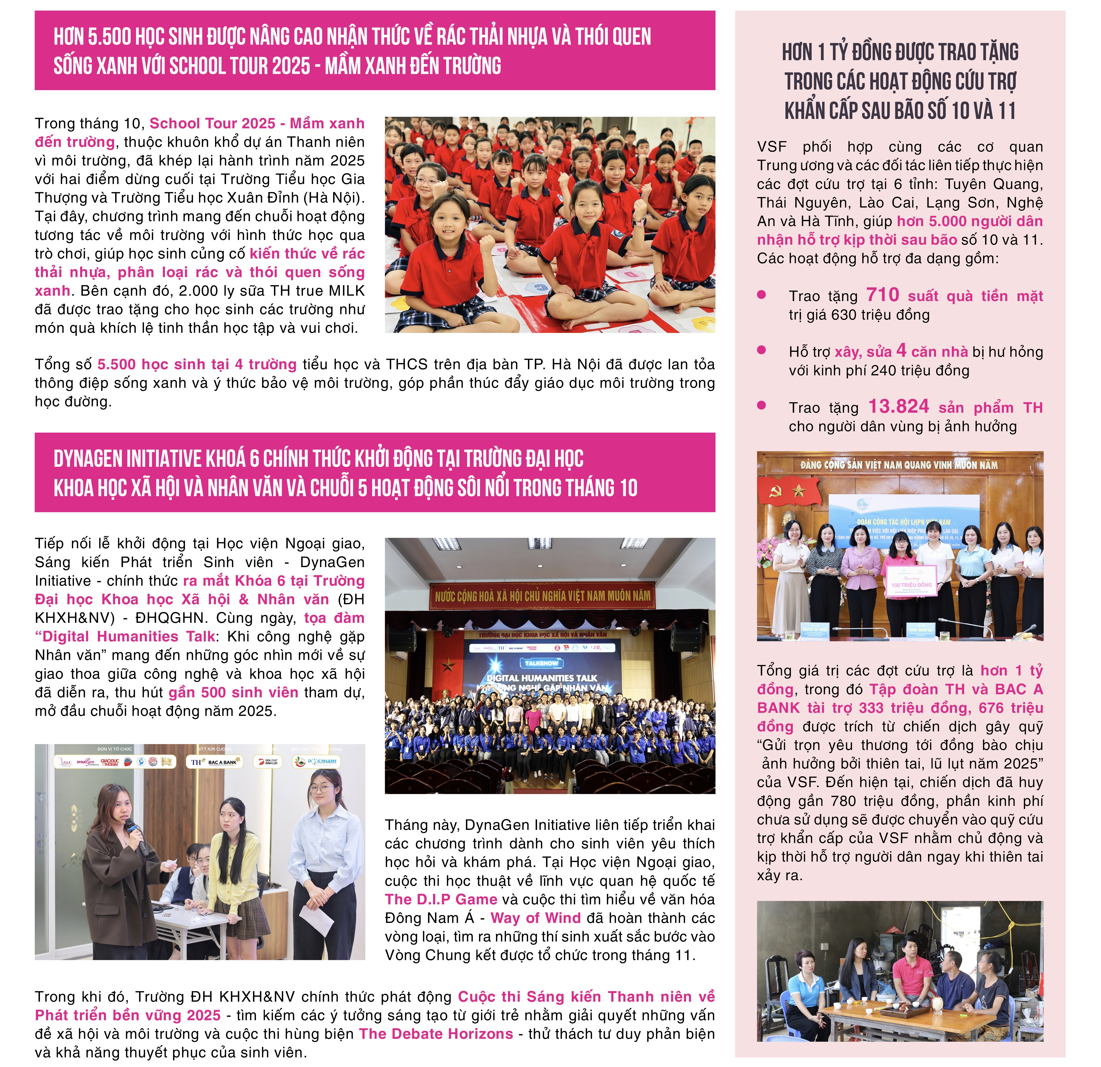 Tháng này cũng ghi nhận những hoạt động sôi nổi của DynaGen Initiative khóa 6, từ lễ khởi động tại Trường ĐH Khoa học Xã hội & Nhân văn đến hàng loạt cuộc thi và tọa đàm thu hút hàng nghìn sinh viên. Trong khi đó, chương trình School Tour 2025 - Mầm xanh đến trường đã lan tỏa thông điệp sống xanh tới hơn 5.500 học sinh tiểu học và THCS tại Hà Nội với sự điều hành của các đại sứ thuộc dự án Thanh niên vì Môi trường.