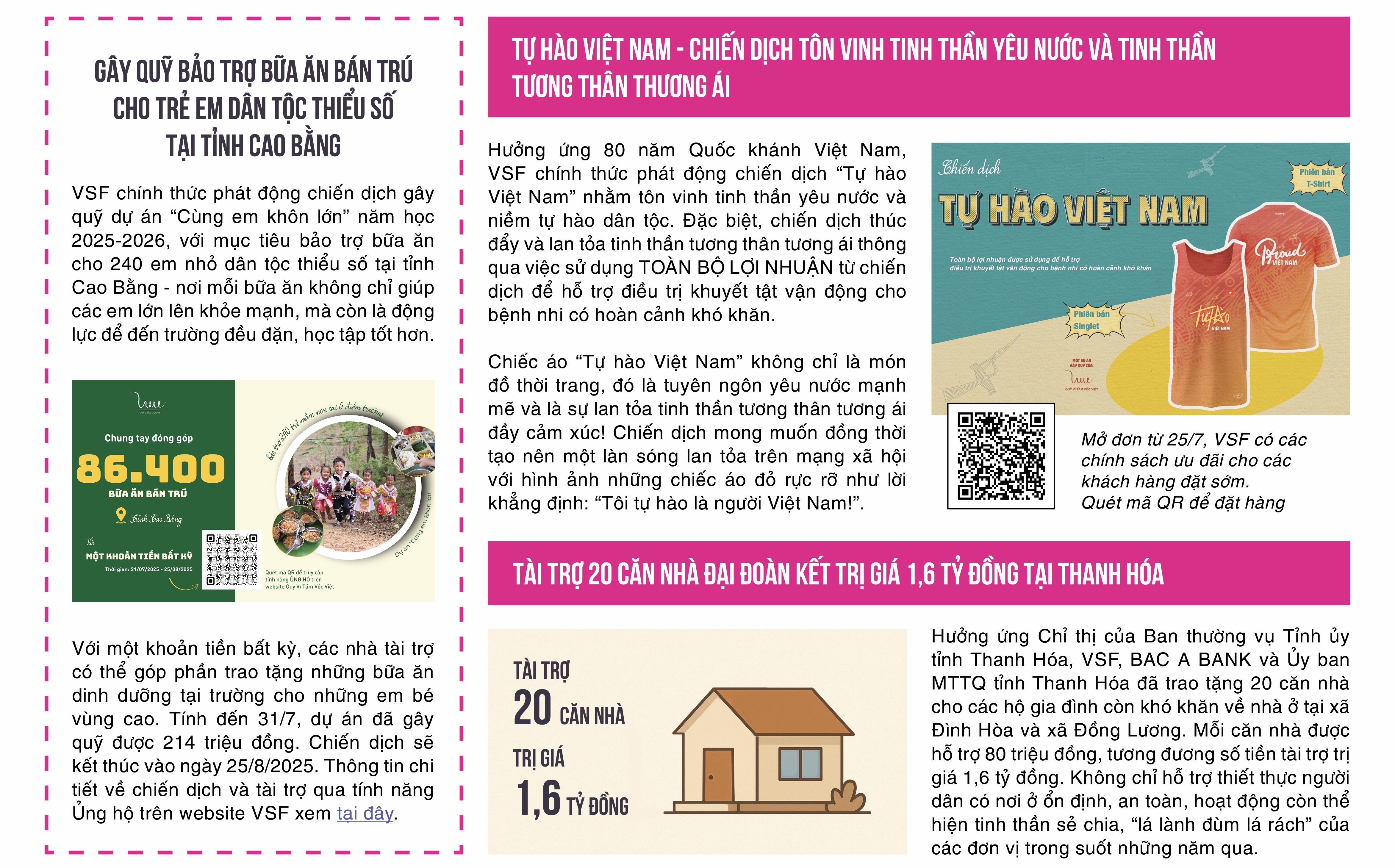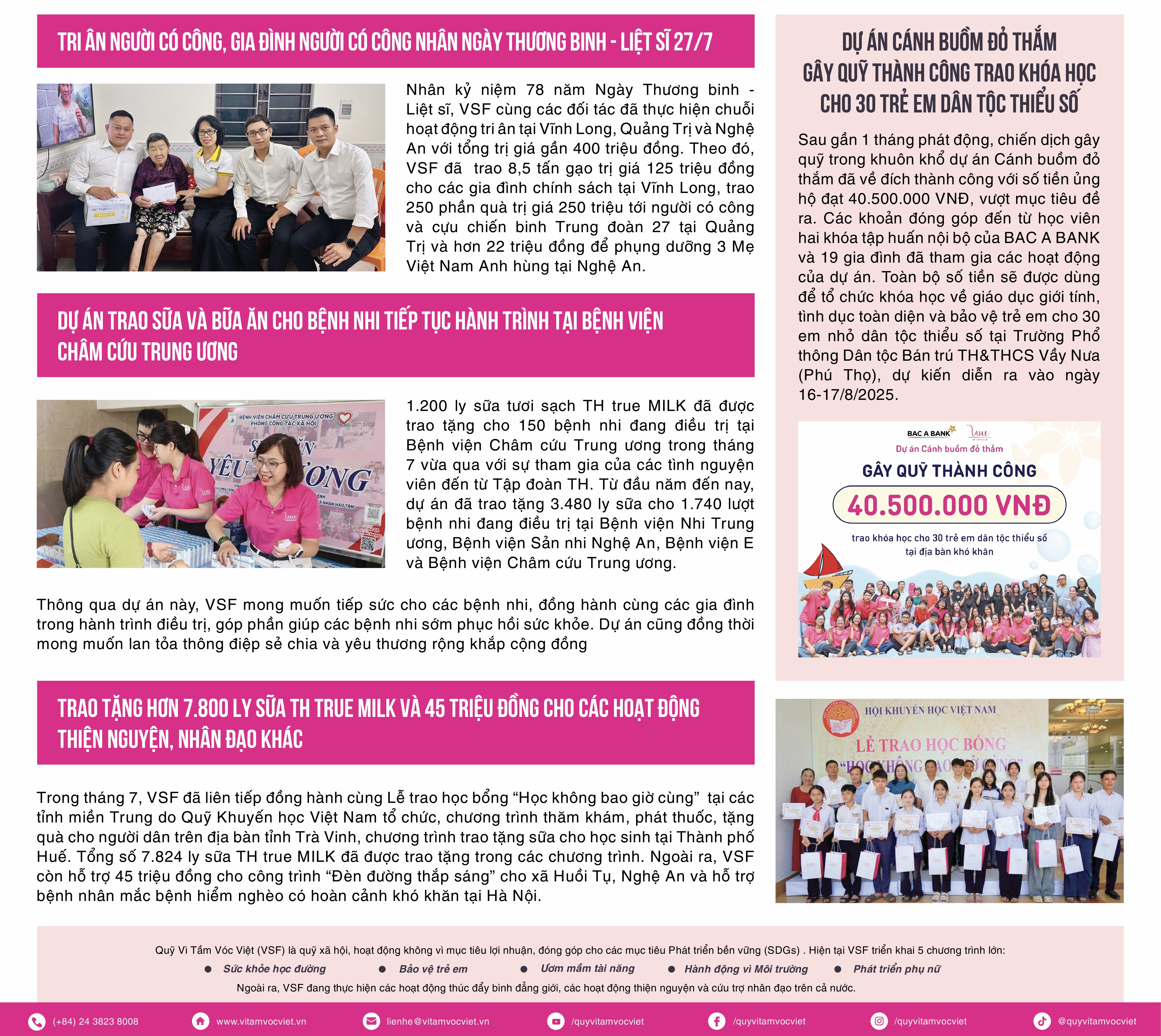 Bên cạnh đó, VSF và các đối tác trao 20 căn nhà đại đoàn kết tại Thanh Hóa, tổ chức chuỗi hoạt động tri ân người có công tại 3 tỉnh với tổng trị giá gần 400 triệu đồng, và tiếp tục hành trình trao sữa, suất ăn, học bổng, hỗ trợ y tế cho trẻ em và người dân có hoàn cảnh khó khăn tại nhiều địa phương.