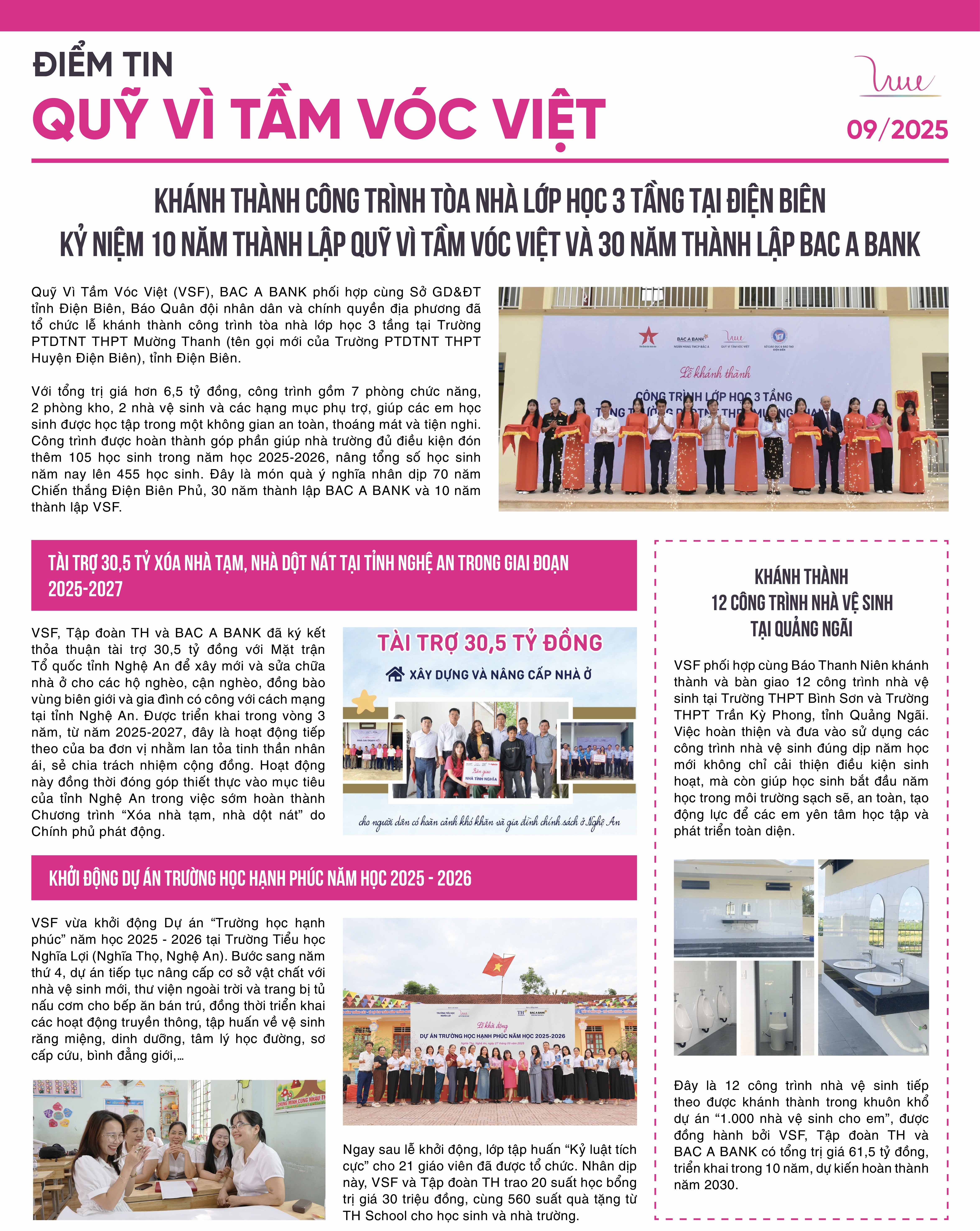 Tháng 9/2025, Quỹ Vì Tầm Vóc Việt (VSF), BAC A BANK phối hợp cùng Sở GD&ĐT tỉnh Điện Biên, Báo Quân đội nhân dân và chính quyền địa phương đã khánh thành công trình tòa nhà lớp học 3 tầng tại tỉnh Điện Biên. Với tổng trị giá hơn 6,5 tỷ đồng, công trình góp phần giúp nhà trường đủ điều kiện đón thêm 105 học sinh trong năm học 2025-2026, nâng tổng số học sinh năm nay lên 455 học sinh. Đây là món quà ý nghĩa nhân dịp 70 năm Chiến thắng Điện Biên Phủ, 30 năm thành lập BAC A BANK và 10 năm thành lập VSF.