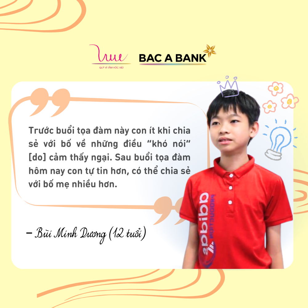 Buổi tọa đàm “Kết nối và chia sẻ” là một hoạt động trong khuôn khổ Dự án Cánh buồm đỏ thắm 2025, do VSF phối hợp cùng BAC A BANK tổ chức. Sự kiện tạo cơ hội để cha mẹ và con cùng trao đổi về những vấn đề thiết thực như giới tính, tuổi dậy thì, bạo lực học đường, và phân biệt đối xử qua những hoạt động tương tác.
