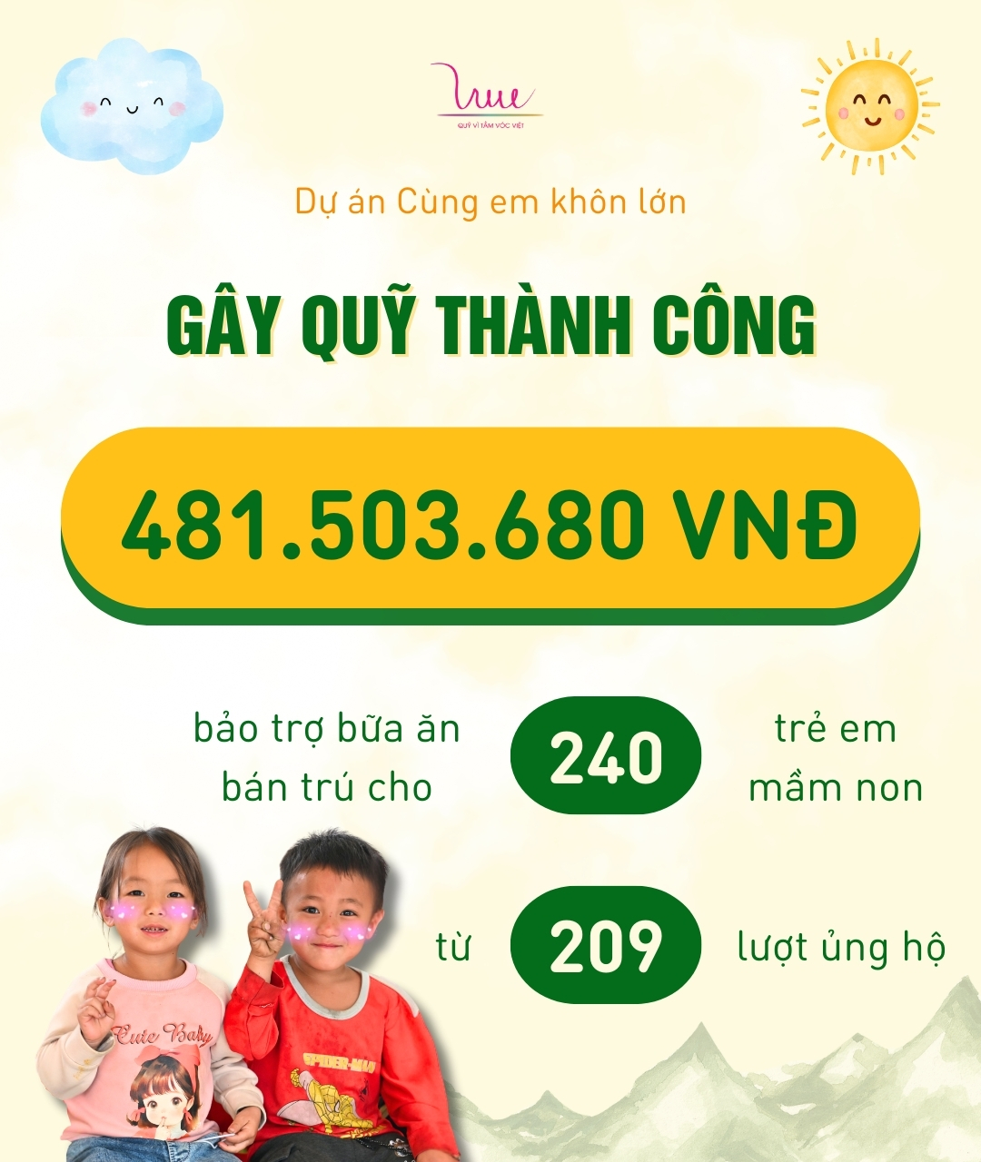 VSF xin gửi lời cảm ơn chân thành đến tất cả những tấm lòng hảo tâm đã đồng hành cùng dự án. Hãy tiếp tục theo dõi fanpage và website của Quỹ Vì Tầm Vóc Việt để cập nhật những hình ảnh, câu chuyện ý nghĩa trong hành trình “Cùng em khôn lớn” sắp tới!