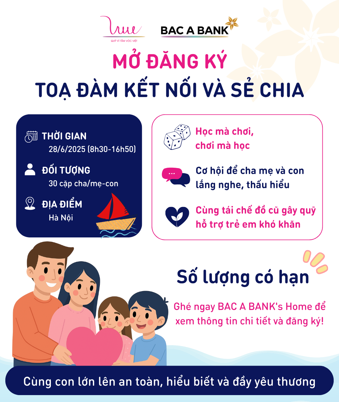 Đây là cơ hội để cha mẹ cập nhật kiến thức, thực hành kỹ năng và kết nối với những người cùng mối quan tâm. Vui lòng truy cập trang chủ của Bac A Bank để biết thêm thông tin về các phương thức đăng ký.