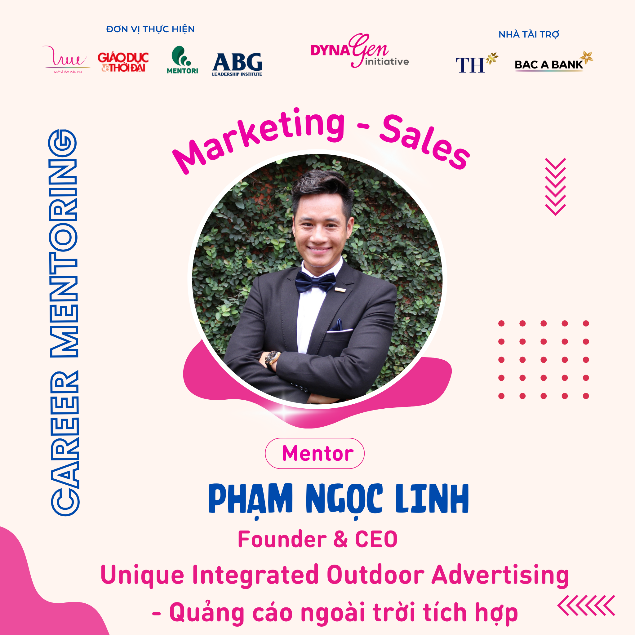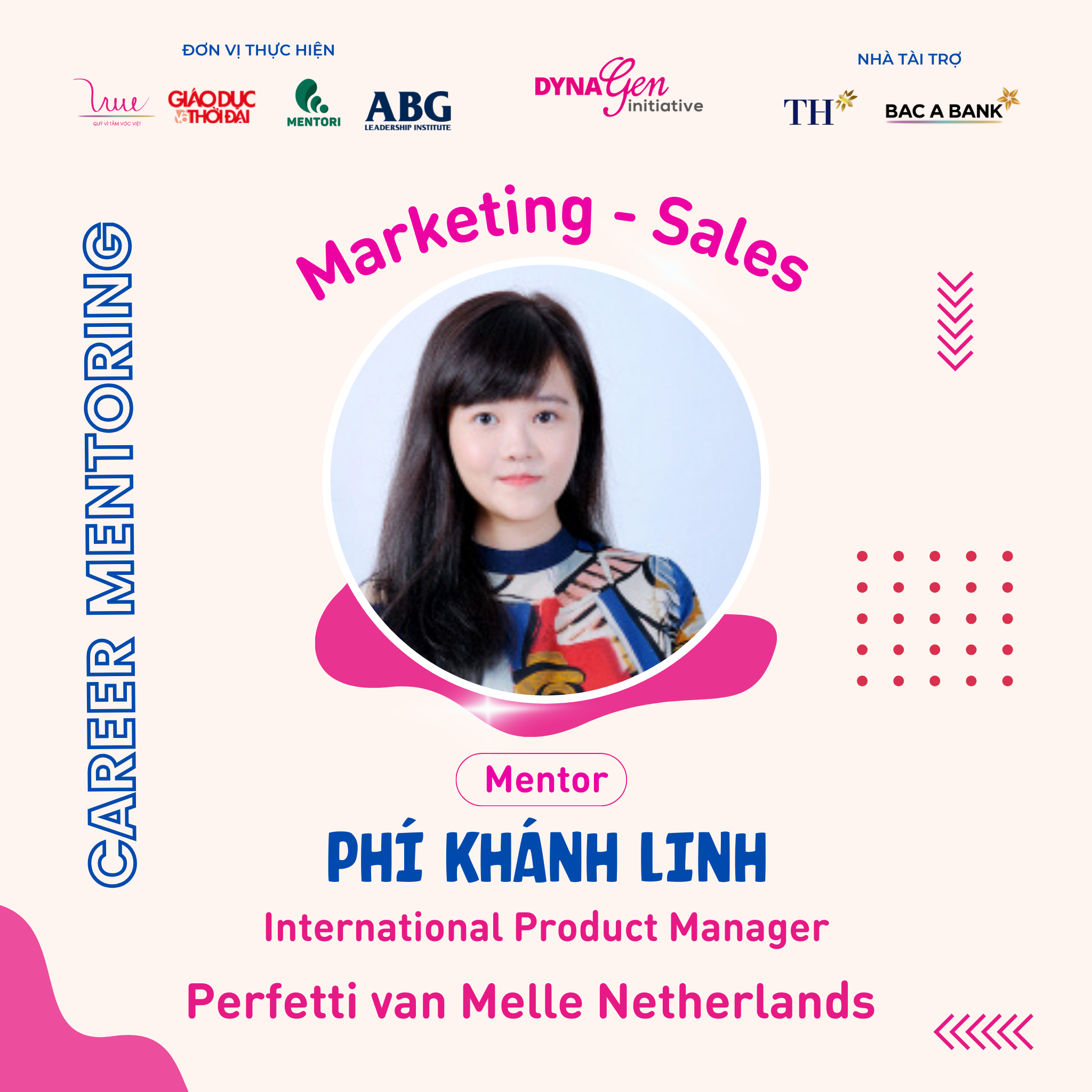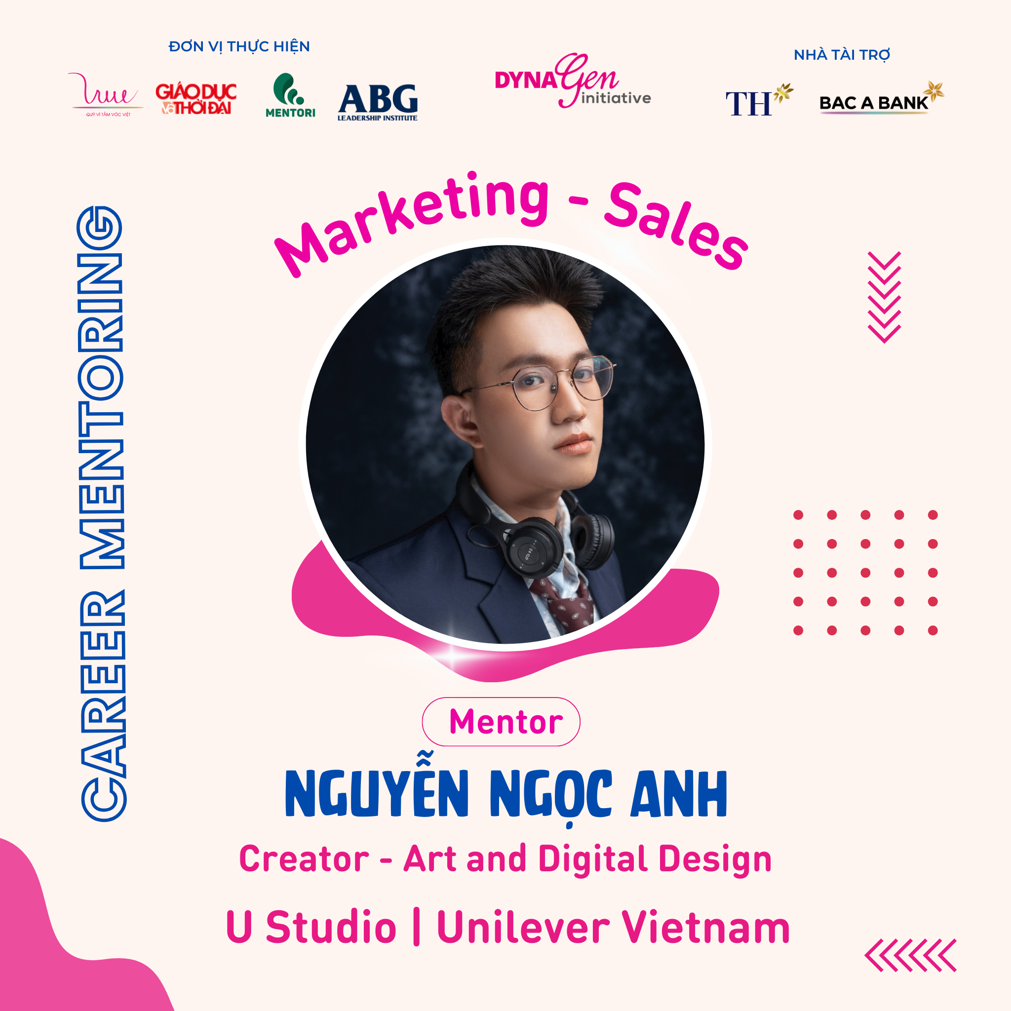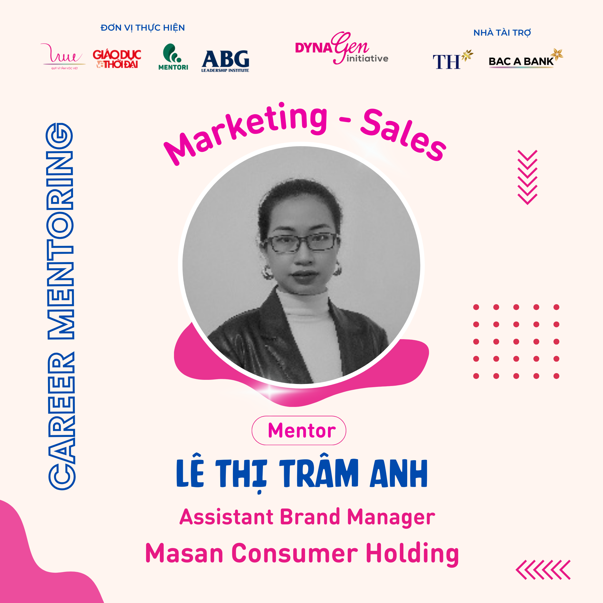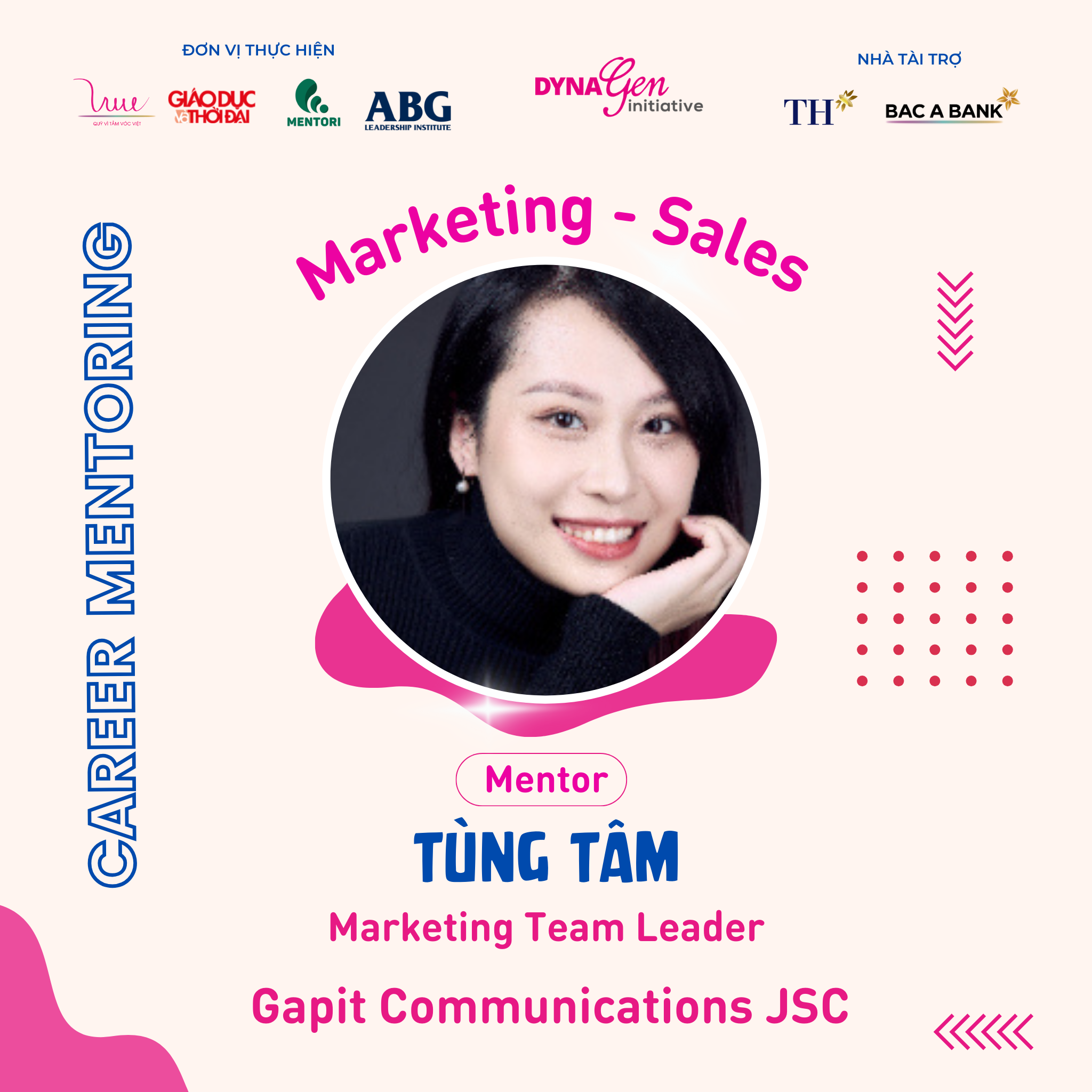 Không chỉ có profile siêu khủng, các anh chị Mentors còn có rất nhiều kinh nghiệm trong cách chinh phục nhà tuyển dụng cũng như xây dựng lộ trình, hướng đi sự nghiệp trong ngành Marketing - Sales, DynaGen Initiative tin rằng các bạn Mentee sẽ thu được siêu nhiều kiến thức và giá trị từ các vị Mentors luôn!!