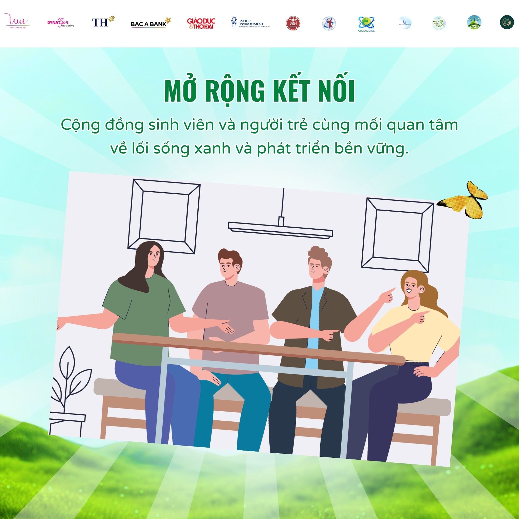 - Kết nối với cộng đồng sinh viên quan tâm tới lối sống xanh, cùng trao đổi góc nhìn và ý tưởng về phát triển bền vững.