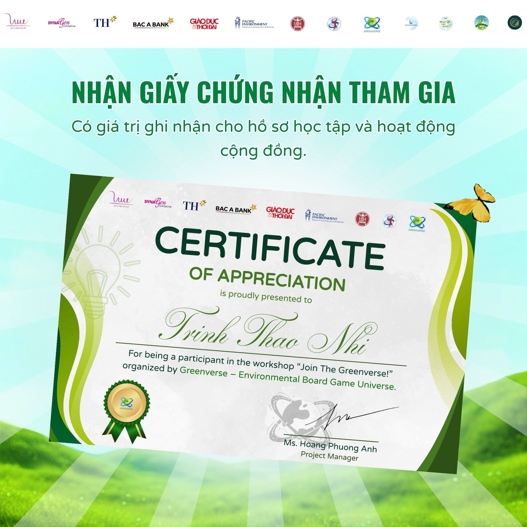 - Nhận Giấy chứng nhận tham gia hoạt động giáo dục môi trường từ Greenverse, ghi nhận cho hồ sơ học tập và hoạt động cộng đồng.