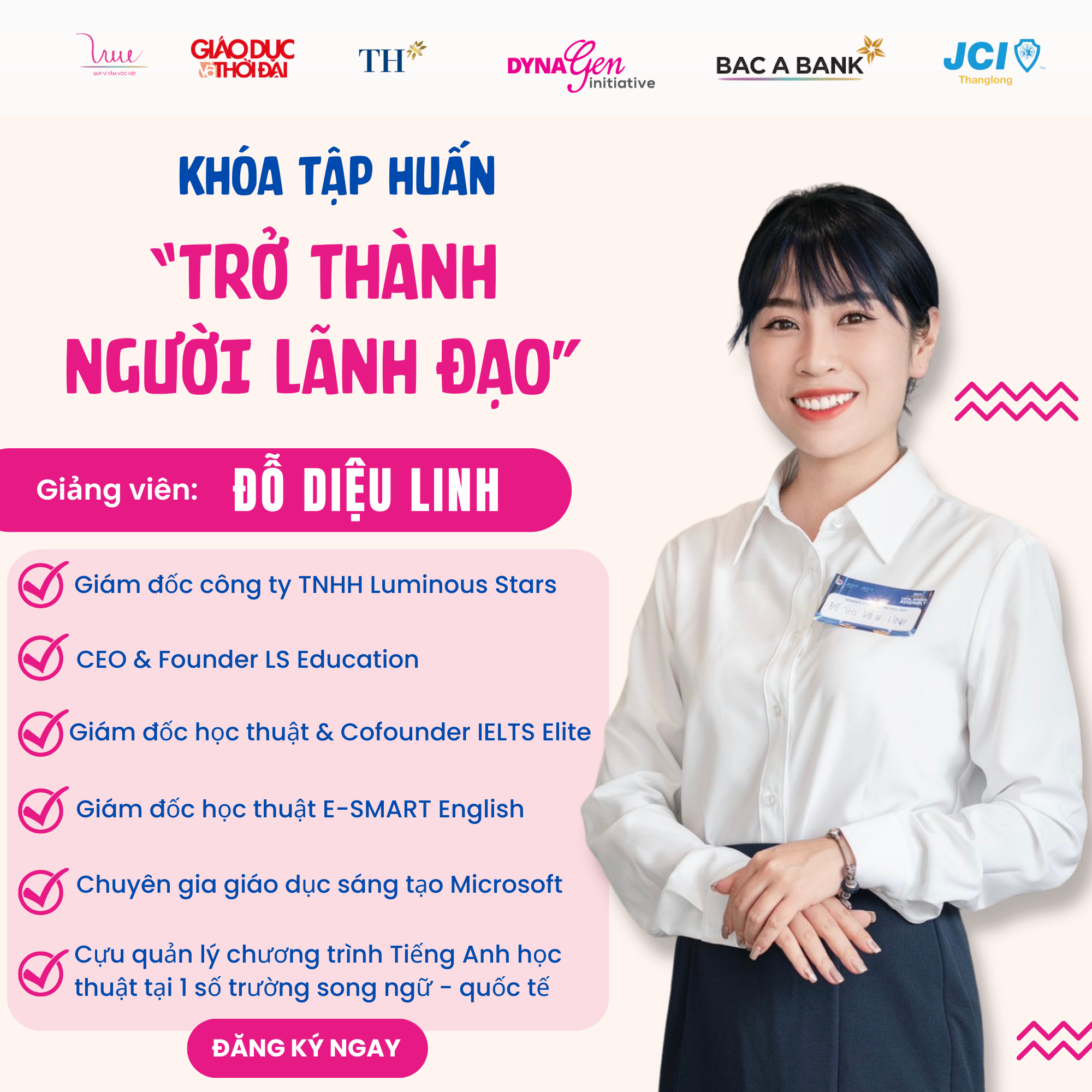 Không để các bạn phải chờ đợi thêm nữa, DynaGen Initiative sẽ bật bí ngay nè! Dẫn dắt khóa Tập huấn lần này đó chính là chị ĐỖ DIỆU LINH. Hiện chị đang công tác trong lĩnh vực giáo dục, hãy cùng nghía qua profile cực kì “xịn sò” của giảng viên lần này bạn nhé!!