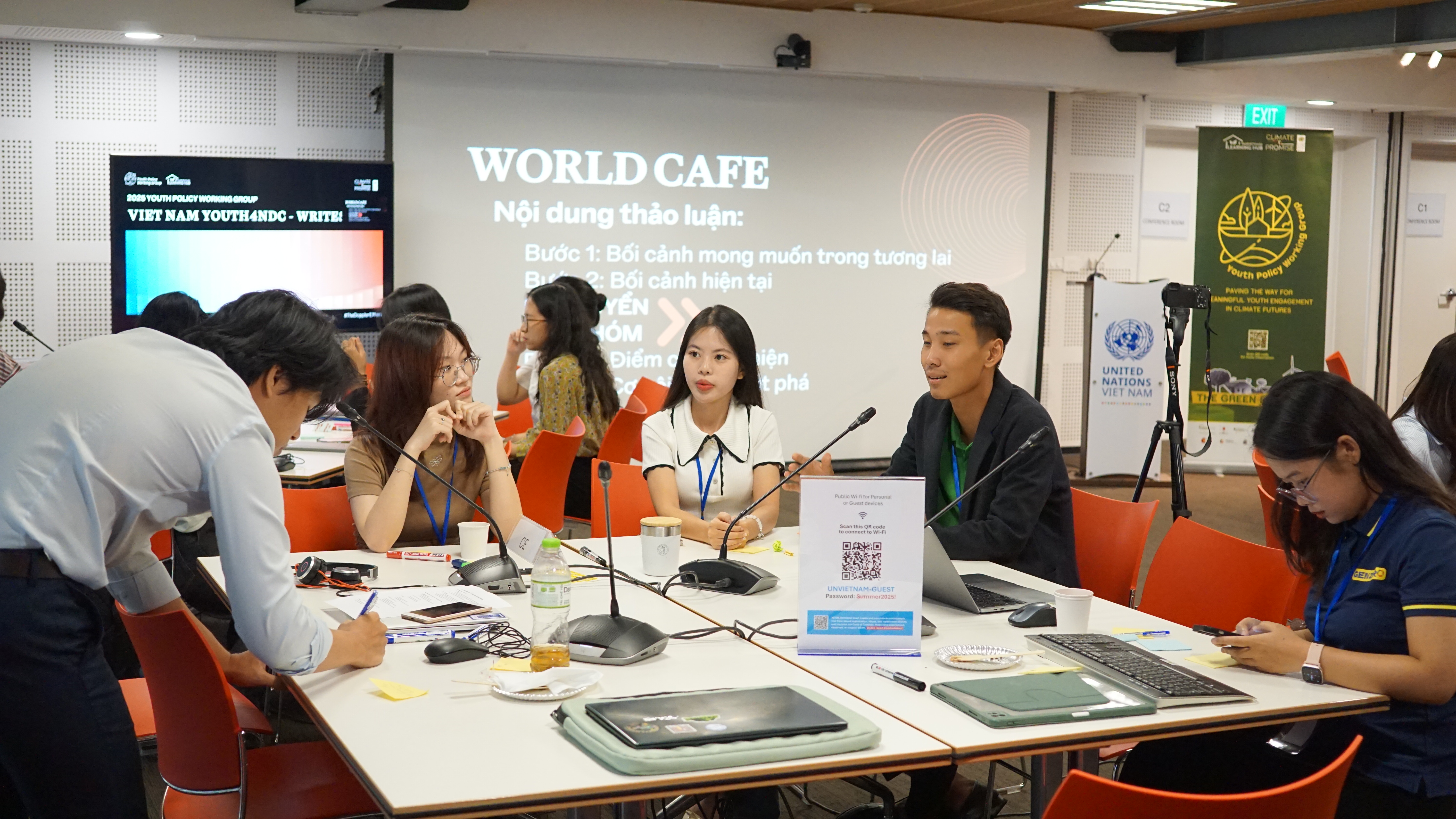 Đối thoại bàn tròn & World Café: Thanh niên thảo luận những khoảng trống chính sách, cơ hội và ưu tiên hành động.