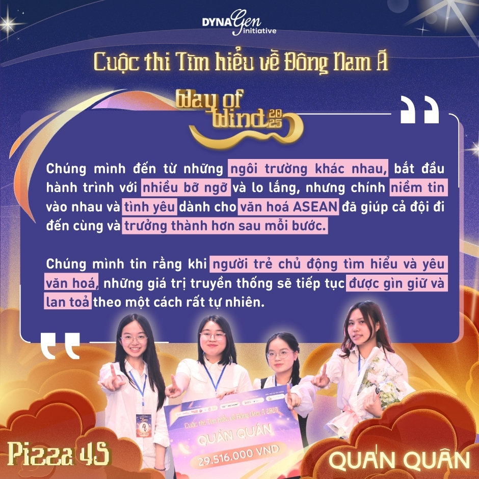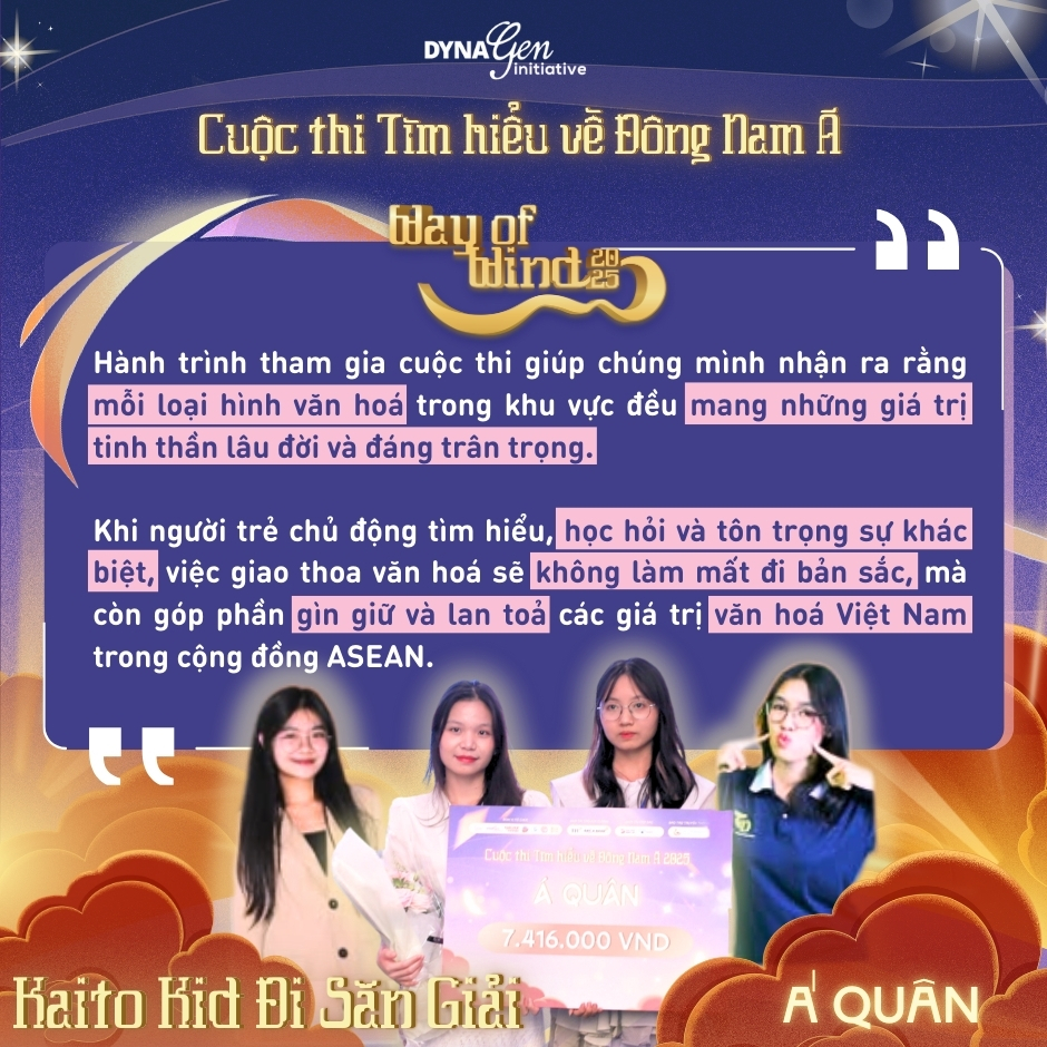 Cuộc thi tìm hiểu về Đông Nam Á - Way of Wind 2025 năm nay đã khép lại với nhiều cung bậc cảm xúc đáng nhớ dành cho các đội thi. Từ những ngày chuẩn bị nghiêm túc, khoảnh khắc hồi hộp qua từng vòng đấu đến niềm tự hào khi nhìn lại chặng đường cả đội đã cùng nhau đi qua.