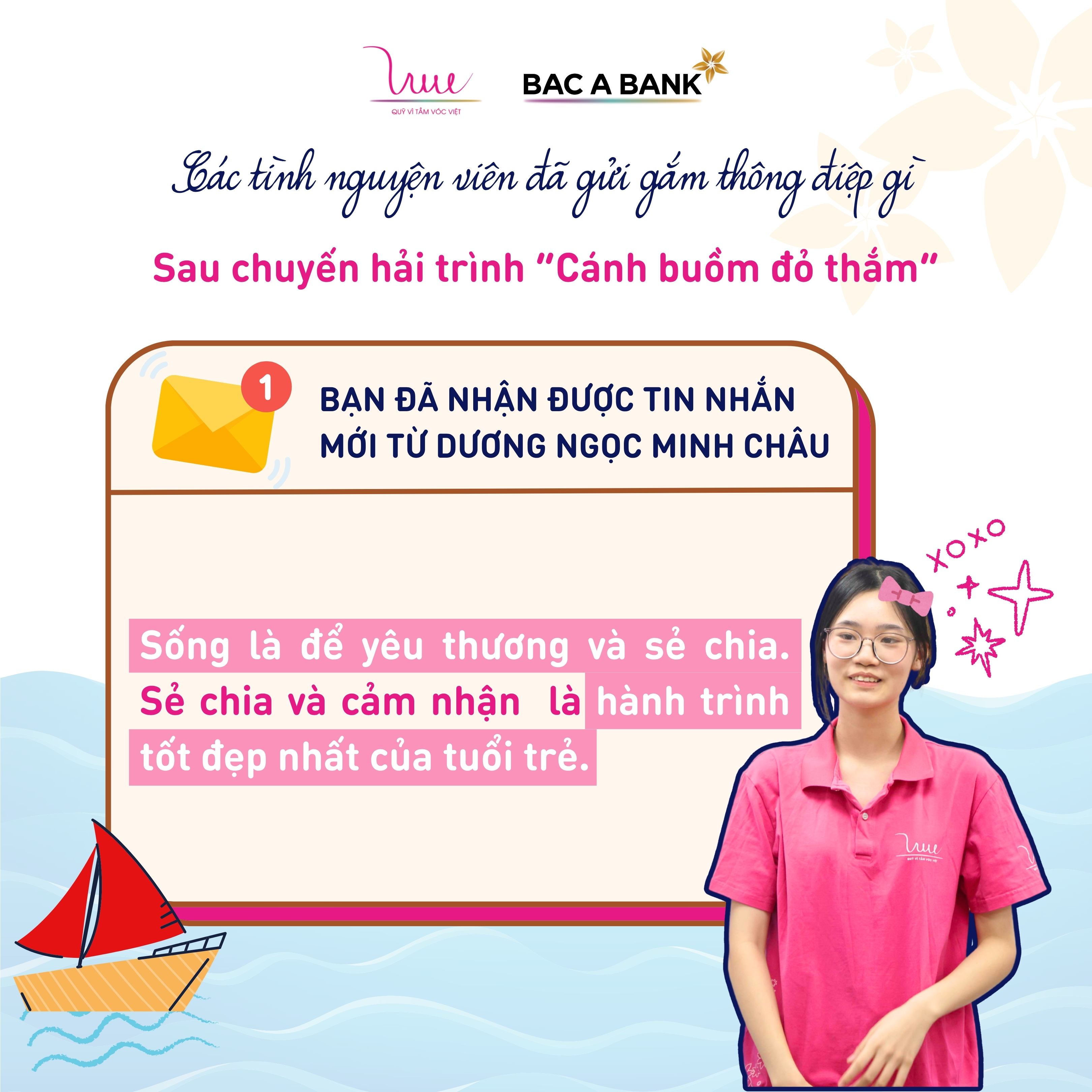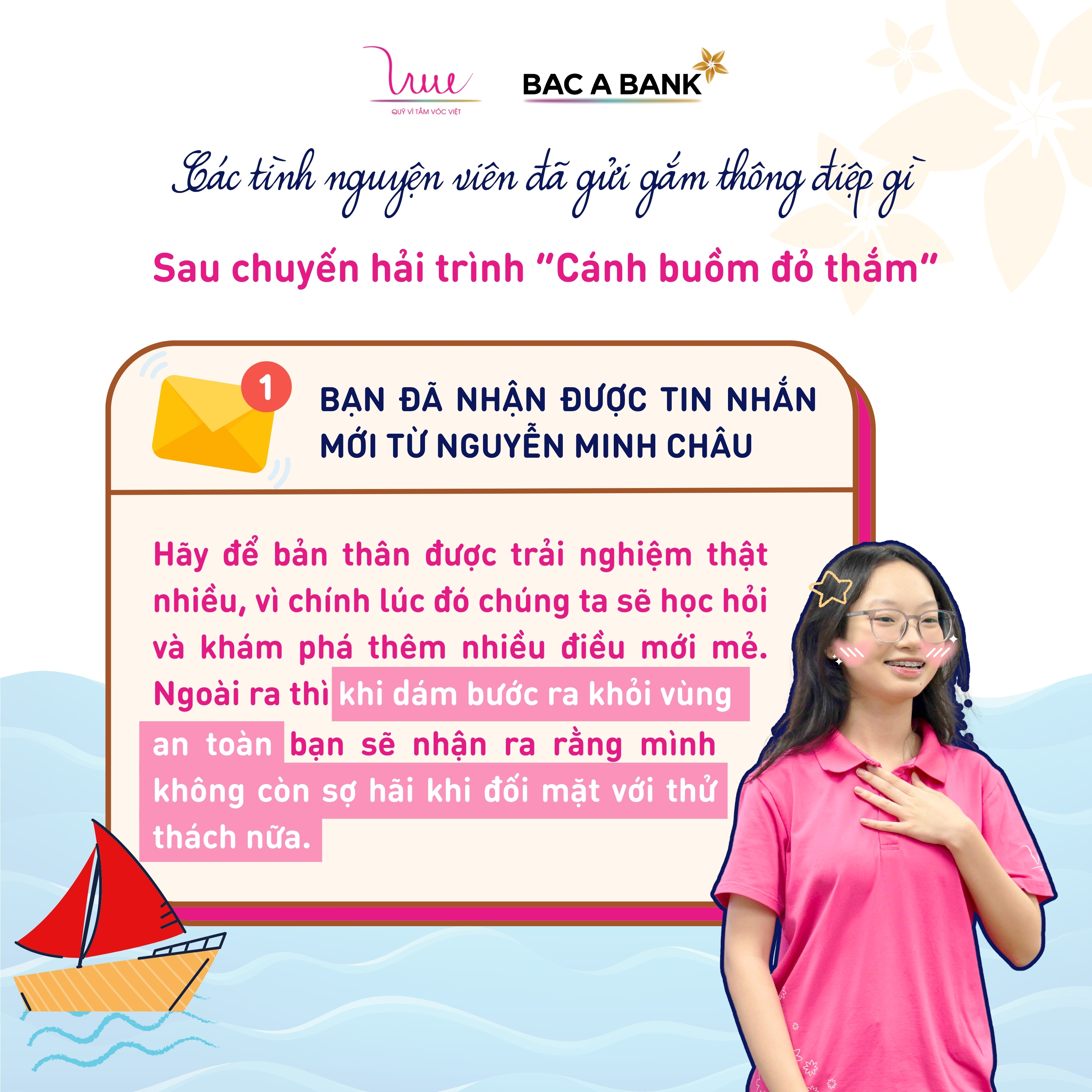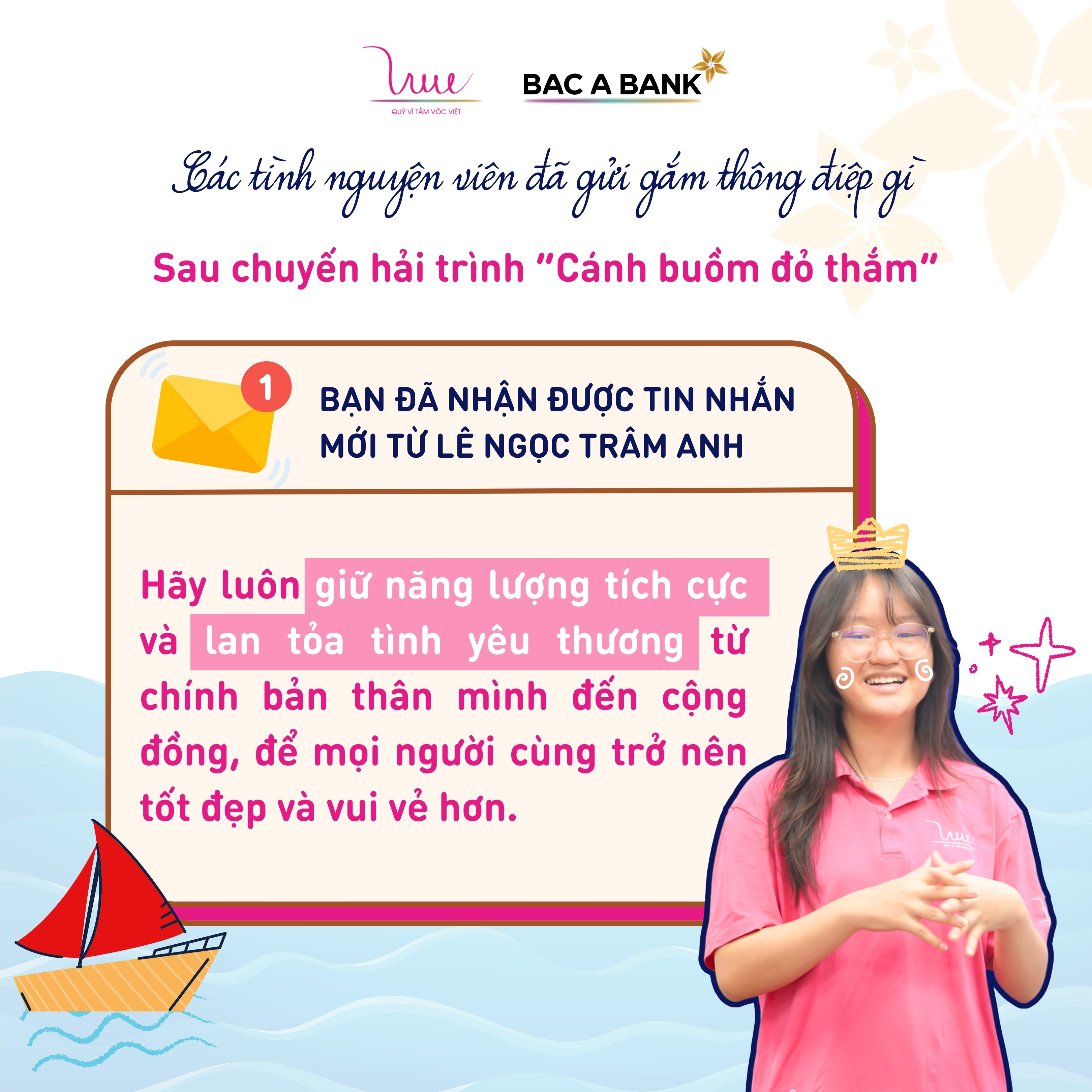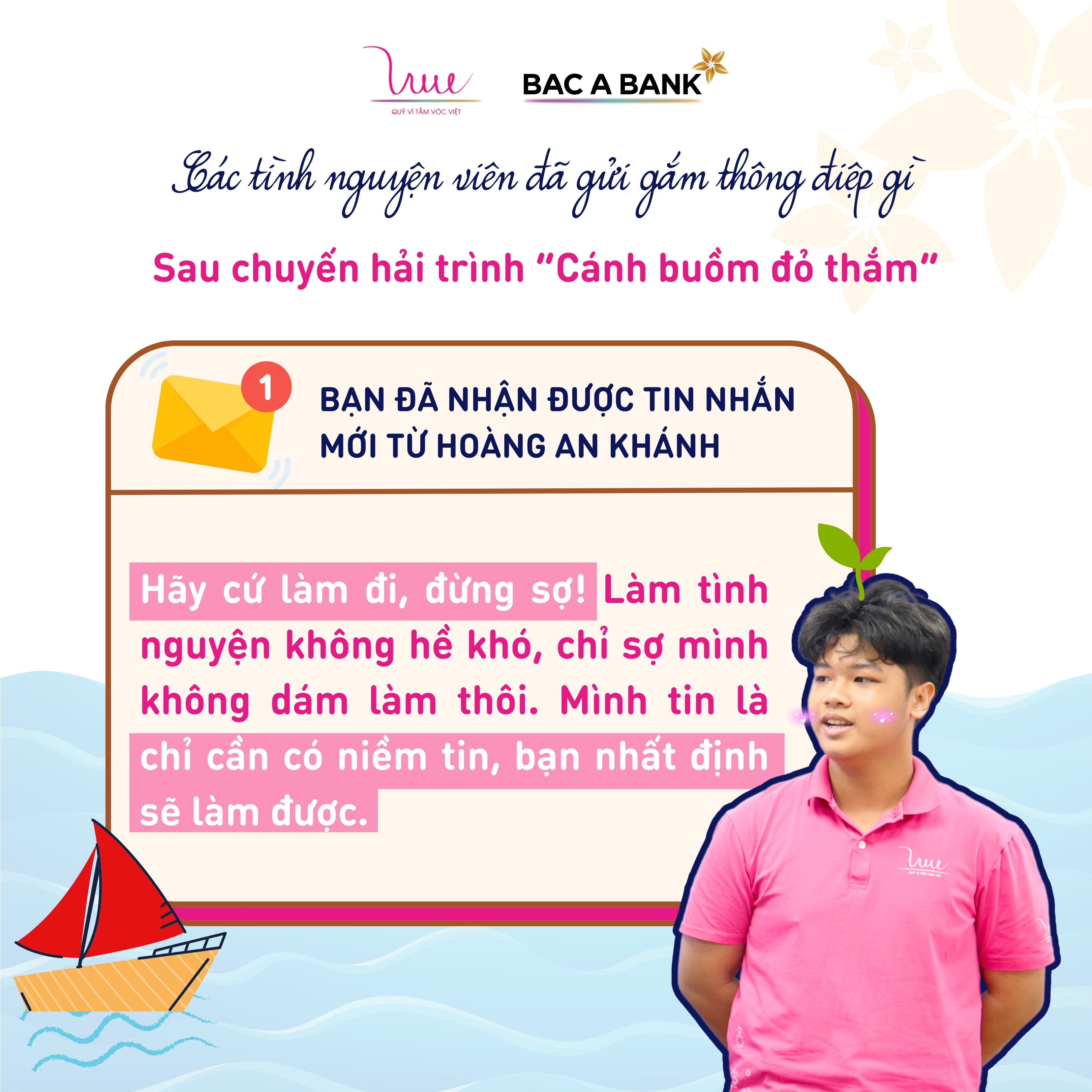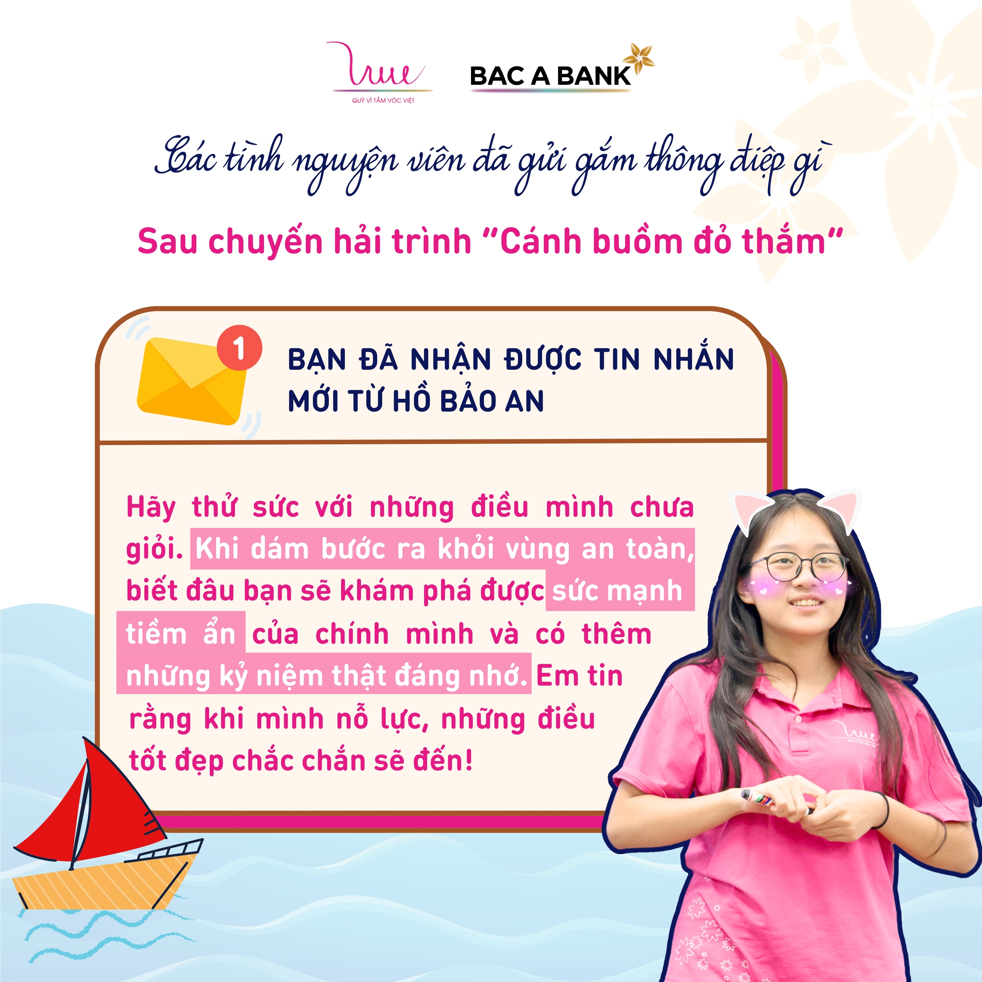 Với các bạn, 5 tháng trở thành tình nguyện viên của “Cánh buồm đỏ thắm” không chỉ là việc hỗ trợ dự án, mà còn là hành trình các em em học cách thấu hiểu, yêu thương và tự tin khẳng định bản thân. Từ sự rụt rè, lo lắng ban đầu, mỗi bạn đều đã trở thành một “thủy thủ” dũng cảm, sẵn sàng bước ra khỏi vùng an toàn và đón nhận thử thách.