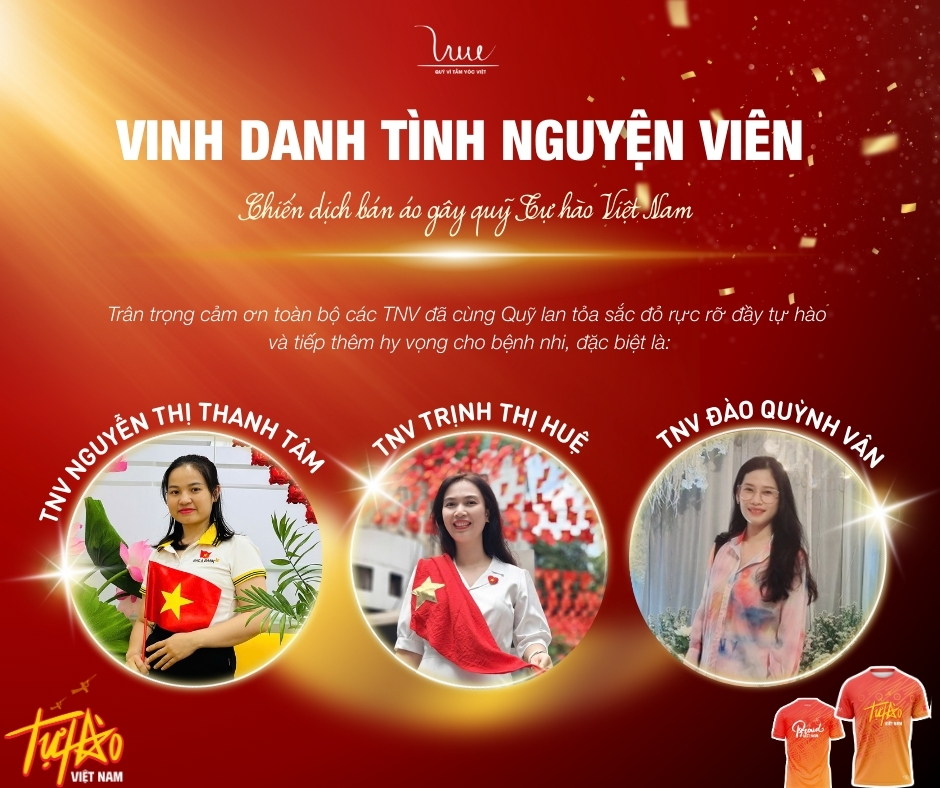 Quỹ Vì Tầm Vóc Việt (VSF) trân trọng cảm ơn các tình nguyện viên (TNV) nhiệt huyết đã góp phần lan tỏa mạnh mẽ tinh thần của chiến dịch bán áo Tự hào Việt Nam trong thời gian qua. Và đặc biệt xin cảm ơn 3 TNV: